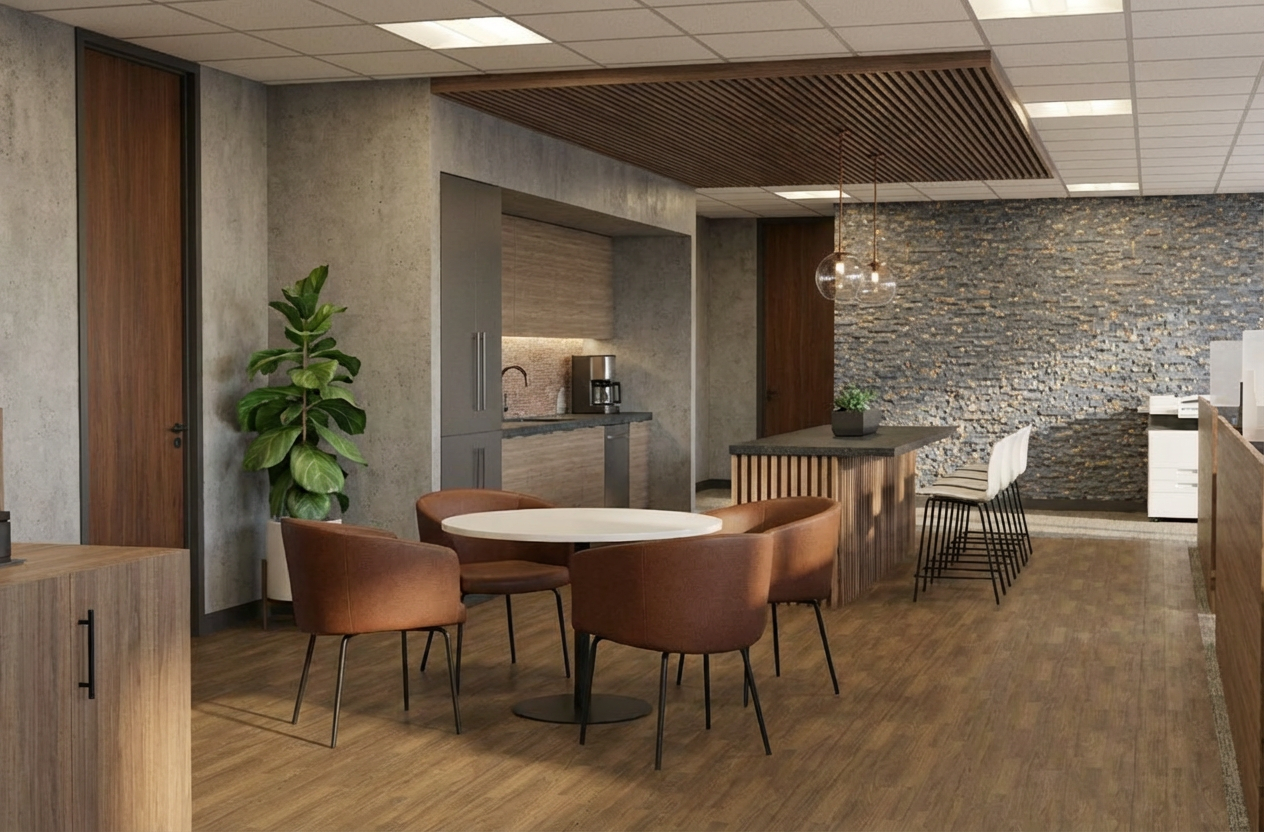 render photo realistic keeping all finishes and structure the same ceiling is standard office grid with 2x2 lights
