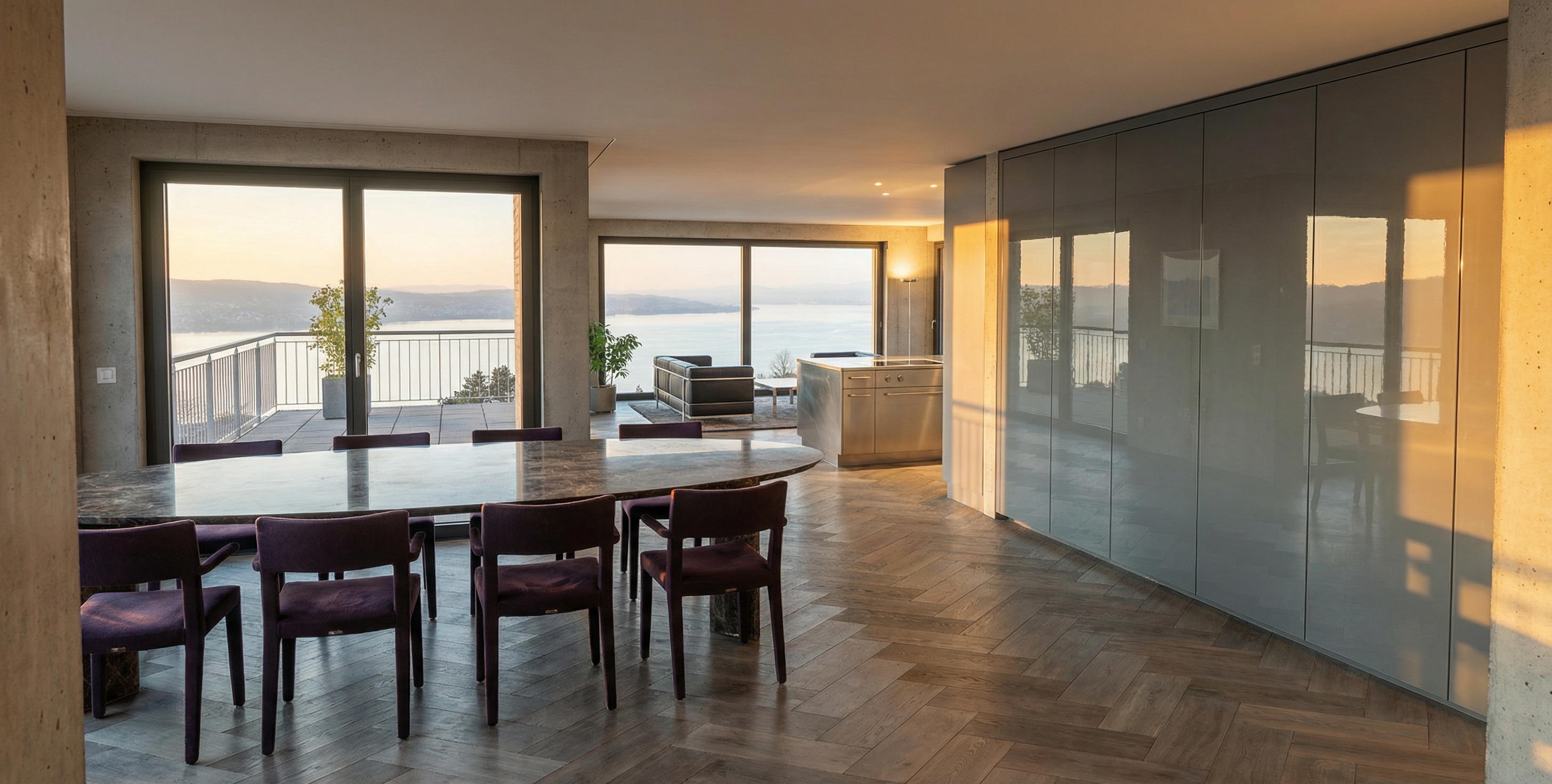 genau dieses rendering berarbeiten fotorealistisches innenraum foto exakt dieselbe perspektive und kameraposition wie das hochgeladene referenzbild 100 identische raumgeometrie exakt gleiche m belanordnung exakt gleiche verlegeart und richtung von parket wie vorlage exakt identische fensterpositionen mit gleichem ausblick auf den z richsee 40 meter tiefer durch die fenster weiches nat rliches tageslicht leicht schr g einfallende sonne durch die grossen fenster geschlossene r ume k nstlich ausleuchten sanfte realistische schatten blickrichtung ist nach s den sonnenlicht kommt von westen realistische materialien echte holztexturen stoff mit leichten gebrauchsspuren hochwertige oberfl chenreflexionen kleine gr npflanzen tisch oval mit marmor collemandina grigio in braungrau dunkel k che edelstahl schrankfronten auf rechter seite alle grauglas gl nzend grifflos parket vergraut alle sichtbaren w nde sind sichtbeton mit modernen leichten vorh ngen in graubeige sehr modernen minimalistischer look nat rliche farbwiedergabe golden hour feeling das bild muss wie eine professionelle fotografie aussehen es soll ein echtes und reales foto sein canon eos r5 35 mm festbrennweite f 2 8 hyperrealistisch dslr qualit t raw aufnahme 8k aufl sung extrem scharf perfekte tiefensch rfe professionelle architekturfotografie