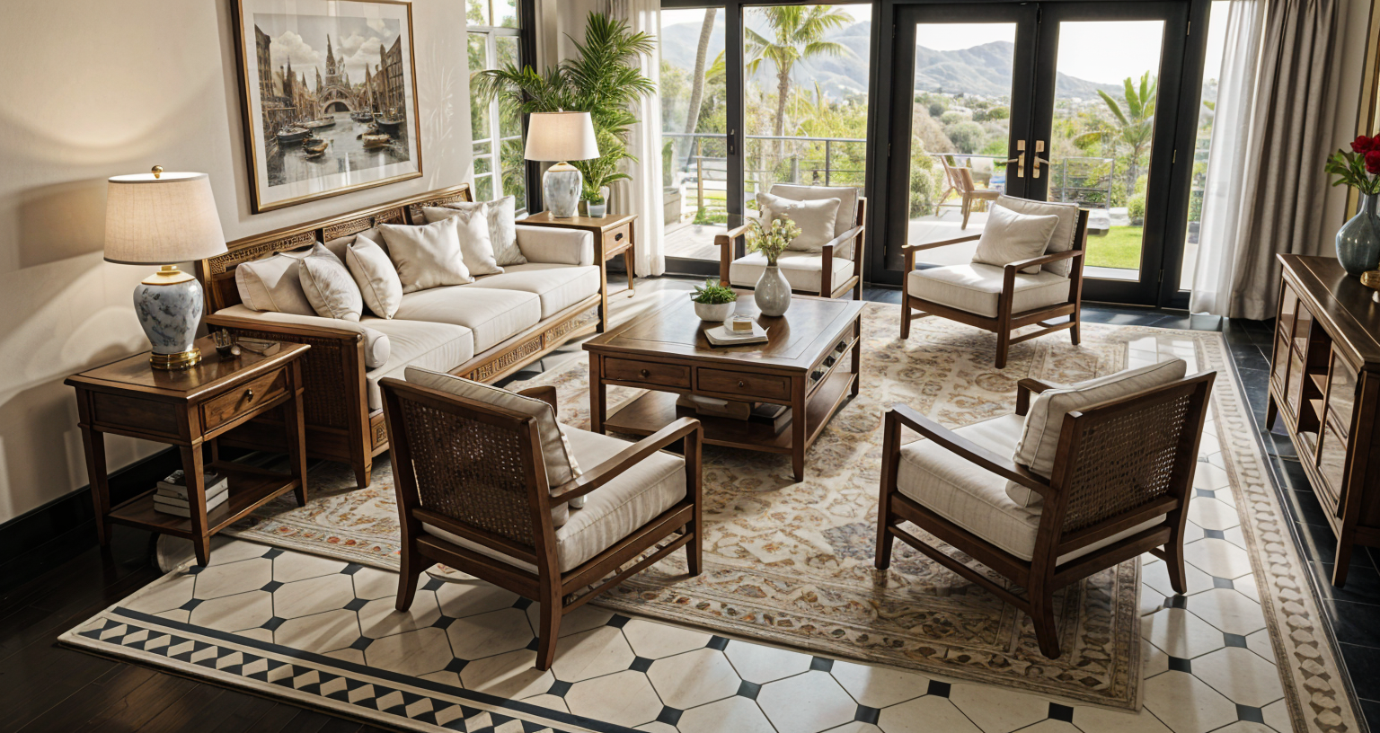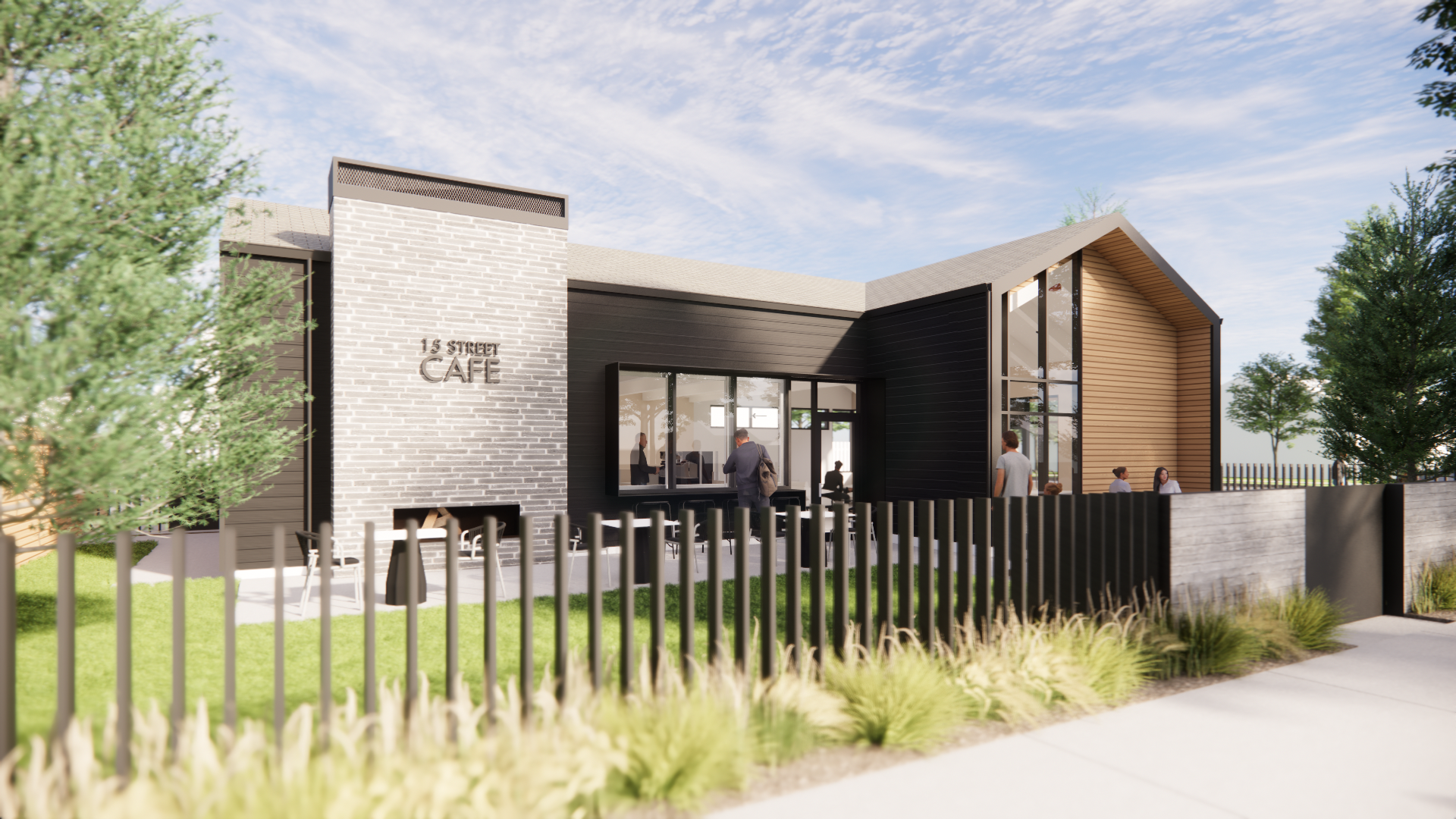 convert this floor plan into a realistic isometric 3d view of a full house show the space from an elevated angle with furniture walls and details visible zoom out slightly and add activity people drinking coffee and dining on the patio people walking and riding bikes on the sidewalk trees lining the sidewalk and streets on the left and right the building sits on a corner lot within a residential neighborhood use the same furniture as shows on the plan do not change the orientation of the floorplan