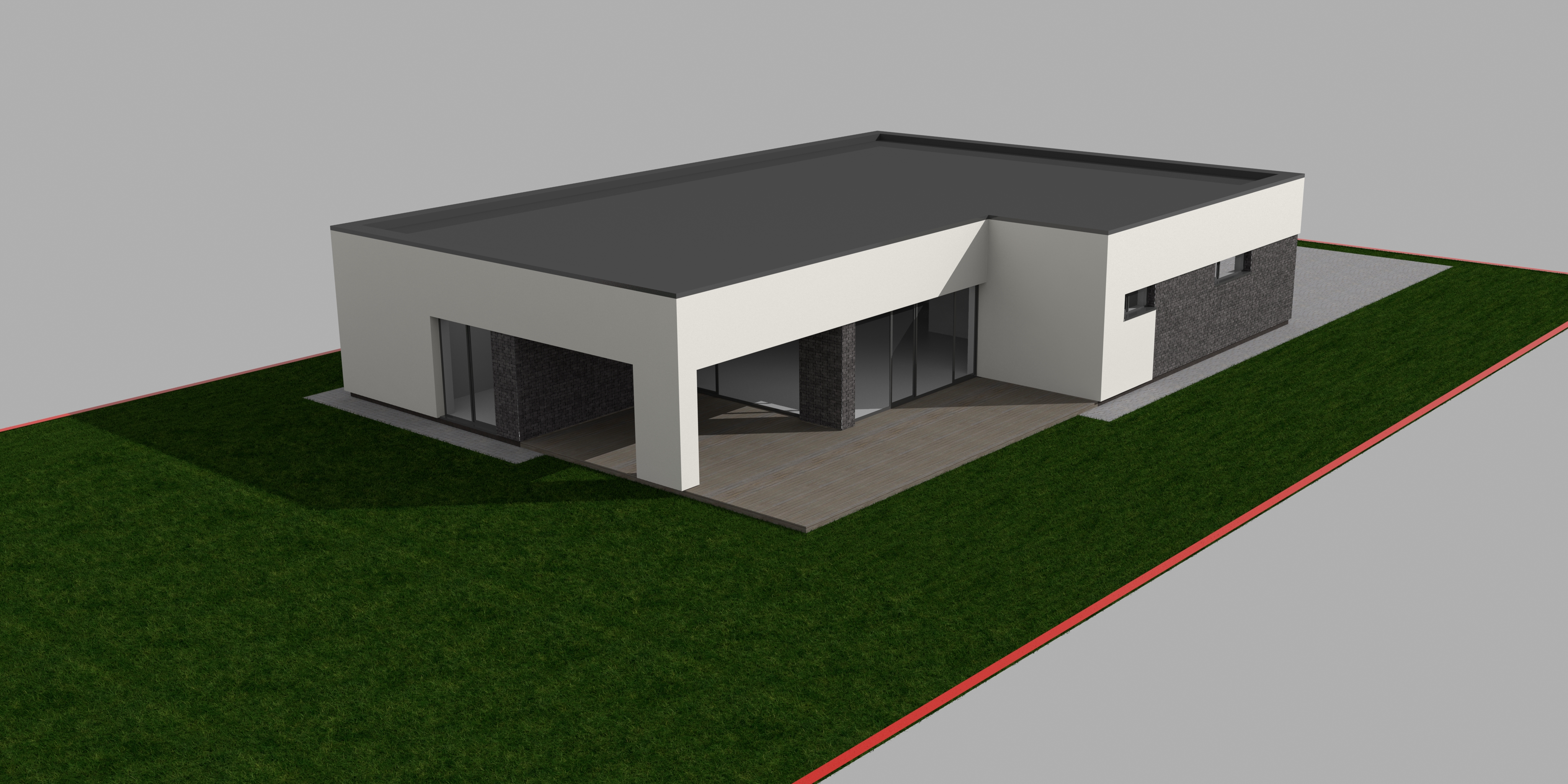 a modern minimalist single story house with a flat roof featuring a sleek white plaster facade and dark gray clinker on the part of the roof are installed solar panels the driveway is paved with light gray paving leading to a dark gray garage door the surrounding landscape includes lush green grass the atmosphere is serene and contemporary set on a mild summer noon with soft natural lighting enhancing the clean lines and contrasts of the architecture change red line to dark grey metal wire fence add some shrubs near the fence