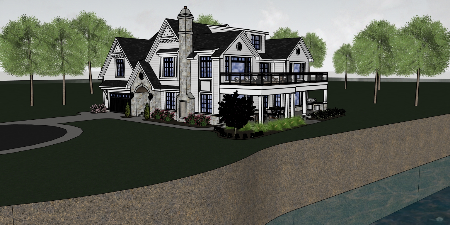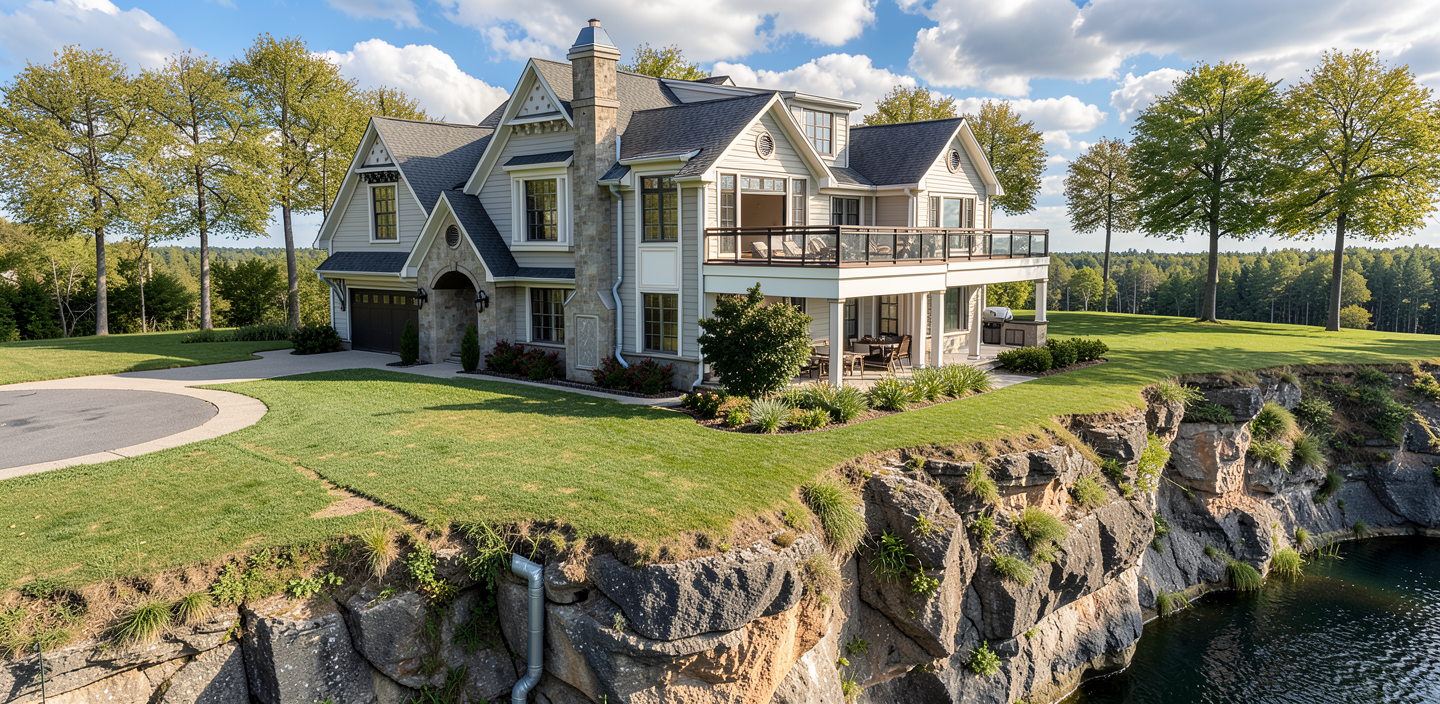 partly cloudy sky add gutters and downspouts on house cliff to lake erie some trees and houses in background