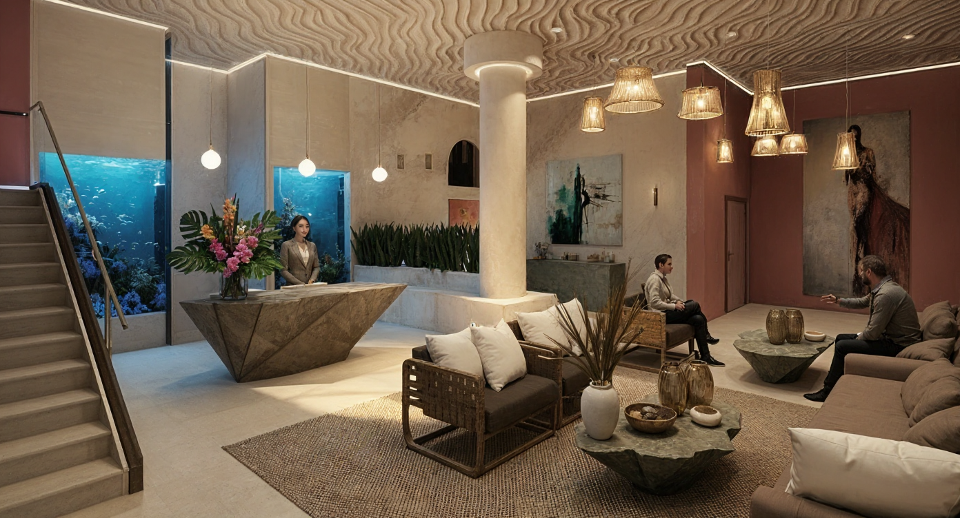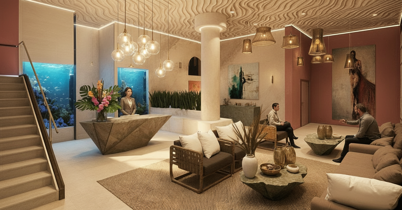 photorealistic coastal port development rendered from a sketchup massing model tropical shoreline with turquoise shallow water transitioning to deep blue sea small wooden fishing boats and dhows anchored near the beach a working port complex with a fish processing and cold storage facility in the foreground warm toned roofs and light industrial materials long concrete piers and ramps extending into the water people walking along the shore and piers at human scale large warehouse structures set back inland surrounded by palm trees green landscape buffers and sandy beach bright midday sunlight clear sky with soft clouds realistic shadows natural colors calm atmosphere aerial oblique view architectural visualization style realistic materials believable proportions no exaggerated forms architecture