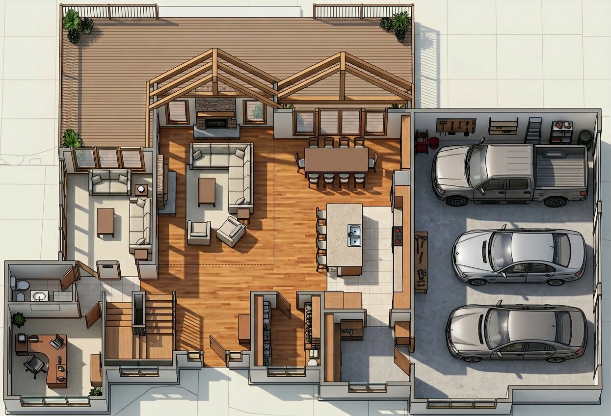photorealistic enhancement of the provided architectural render preserve the exact architecture layout materials furniture placement and fixtures from the original image with no redesign or modifications the purpose is only to improve realism and lighting quality render as high end interior photography using a full frame camera with a 24 35mm architectural lens balanced exposure realistic dynamic range subtle depth of field and natural color grading the image should look like a professionally photographed luxury interior rather than a computer render soft natural daylight diffused window light global illumination balanced exposure do not change architecture do not change materials no redesign no new objects no additional lights no glowing fixtures no light from shower heads or faucets no dramatic shadows no surreal lighting no warped geometry no stylization the windows looking out to the exterior should be displaying mountains in the distance some trees please include contemporary bedroom furniture that includes a king bed two nightstands and a dark area rug there should be a sconce above each nightstand the furniture style should resemble restoration hardware