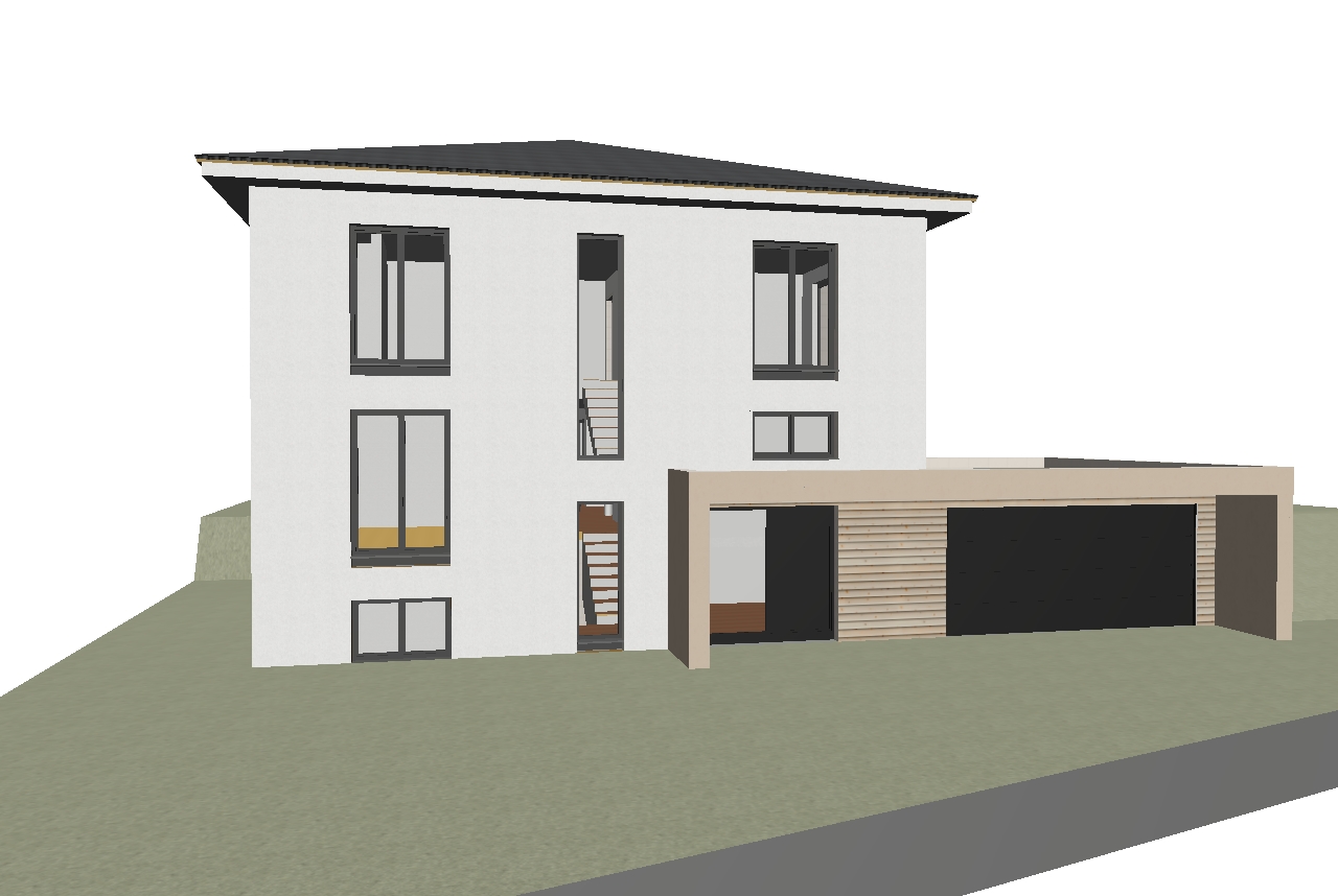 modern minimalist house three stories high crisp white facade with large windows framed in sleek black metal elegant wooden accents with light oak tones flat black roof attached garage with light taupe panels lush green lawn surrounding soft natural lighting serene and peaceful atmosphere subtly overcast sky with diffused sunlight