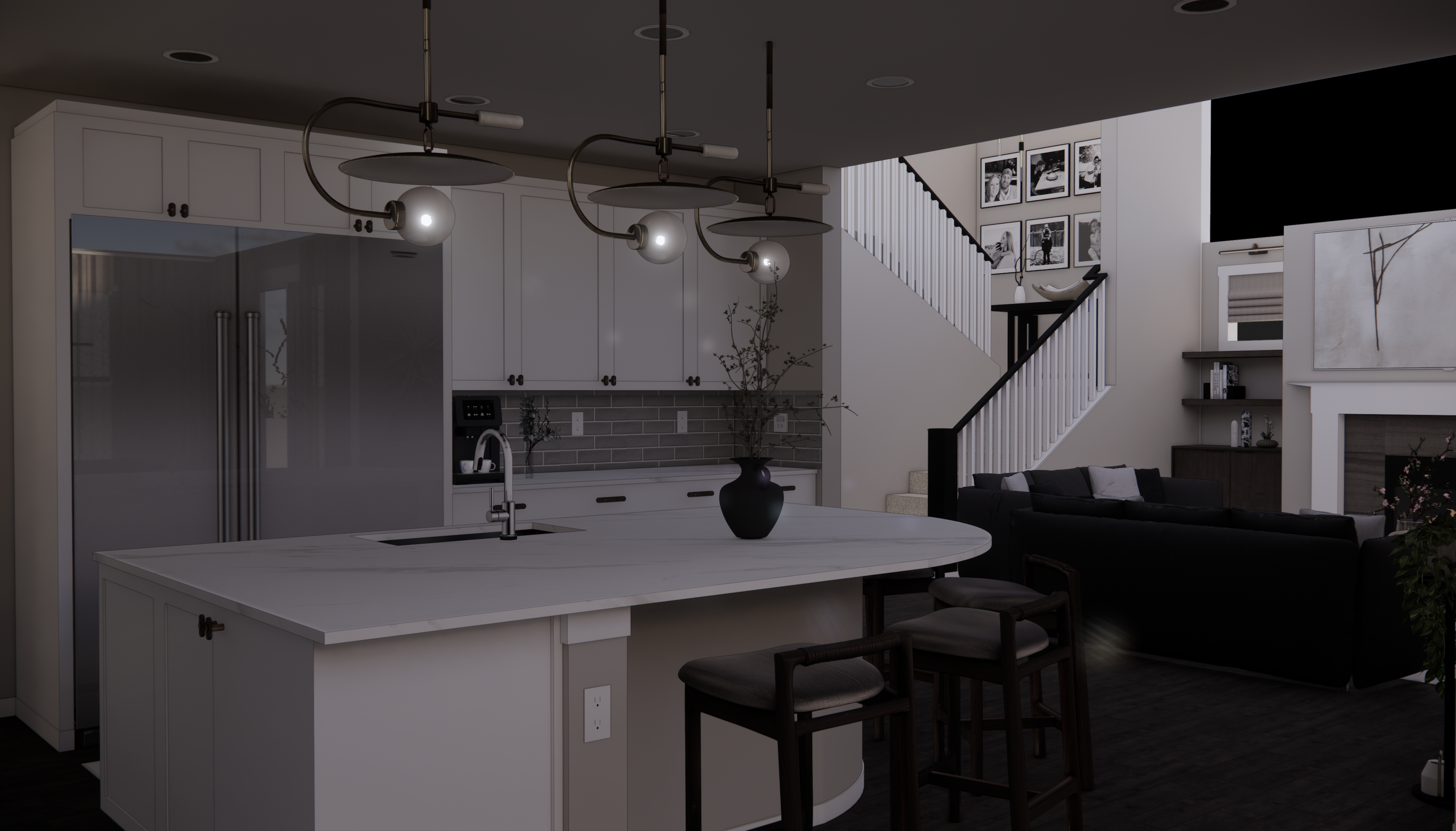 enhance this modern kitchen scene in real time render maintain all existing materials textures and original color scheme exactly as shown do not alter the design improve realism with physically accurate lighting balanced reflections and subtle global illumination enhance surface finishes to highlight modern details such as countertops cabinetry and flooring add soft natural daylight with realistic shadows complemented by warm ambient interior lighting ensure metallic glass and matte surfaces show accurate depth gloss and reflection without exaggeration overall effect photorealistic clean modern and inviting true to the original colors and design intent