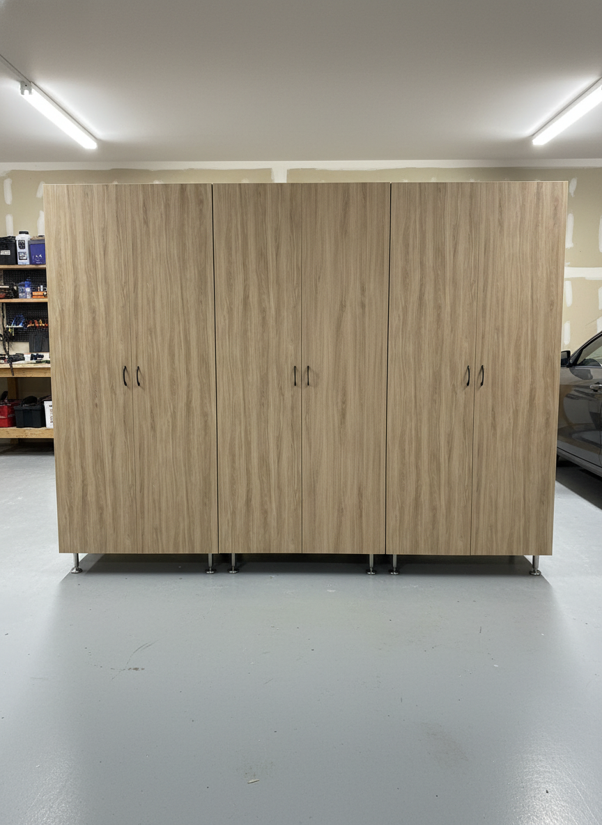add garage cabinet with 6 adjustable leg underneath make a few cabinets next to eachother add work bench add epoxy floor