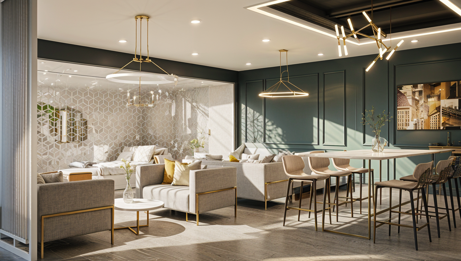 a modern kitchen with sleek design featuring smooth white cabinets and a polished marble countertop in soft grey tones the kitchen atmosphere is bright and contemporary with ambient warm lighting creating a cozy aura include a high end matte black coffee machine and neatly arranged white cups on the shelves the backsplash should be a subtle frosted glass with hints of beige enhancing the elegant look light wooden drawers contrast the charcoal grey tiled floor adding warmth and sophistication add small touches of greenery for freshness and scattered modern kitchen utensils for a lived in feel