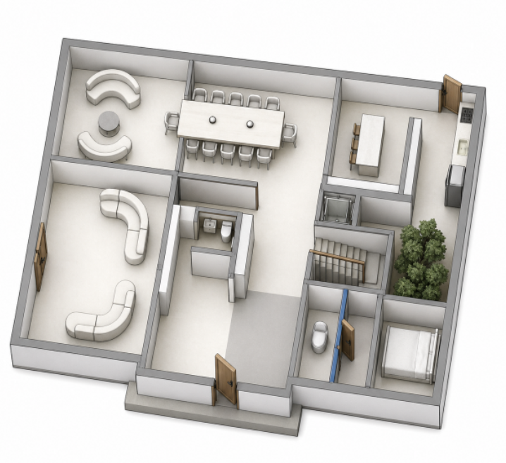 convert this floor plan into a realistic isometric 3d view of a full house show the space from an elevated angle with furniture walls and details visible japandi minimalist living room warm neutral color palette beige cream taupe soft natural materials large modular low sofa in light fabric rounded organic coffee table in stone or travertine textured rug with subtle abstract pattern floor to ceiling sheer curtains layered with heavier drapes vertical wooden wall panels soft indirect lighting recessed ceiling lights calm atmosphere elegant and cozy minimal decor with ceramic vases and natural branches soft shadows high end interior design realistic render use the same furniture as shows on the plan do not change the orientation of the floorplan