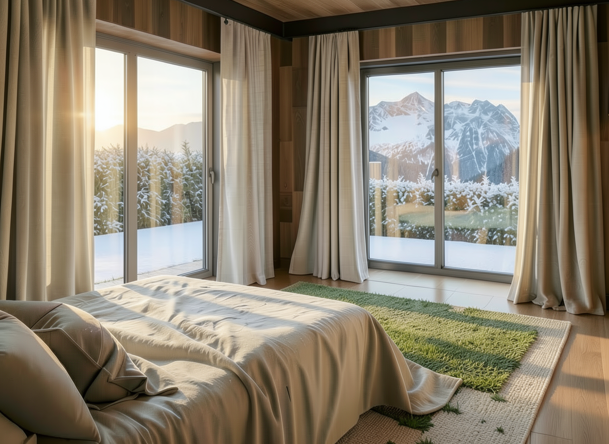 place a modern walk out basement cabin on the property higher on the hill lots of glass to take advantage of the mountain scenery wooden siding with a metal roof and black window trim a nice deck on the second level with a wire railing for maximum views
