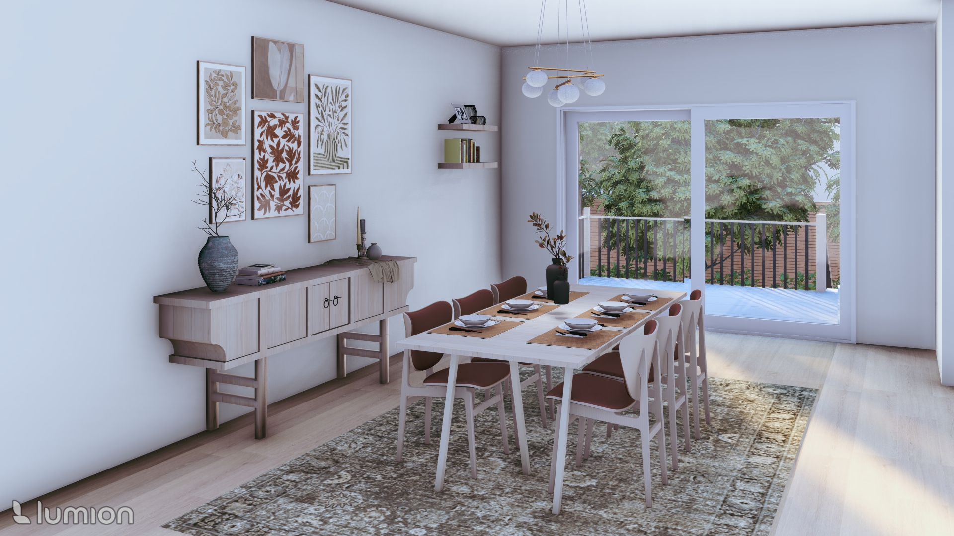this is an already rendered picture of a family home add realistic textures to the surfaces without changing the colors or anything else add soft warm lighting from the ceiling light above the dining warm table add a backyard view and wood to the porch from the sliding glass door