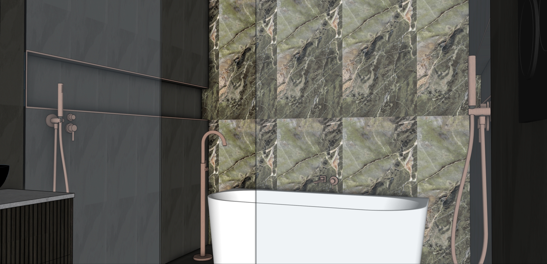 make the dark wall tiles darker to better reflect the original render keep the tiles behind the bath the same