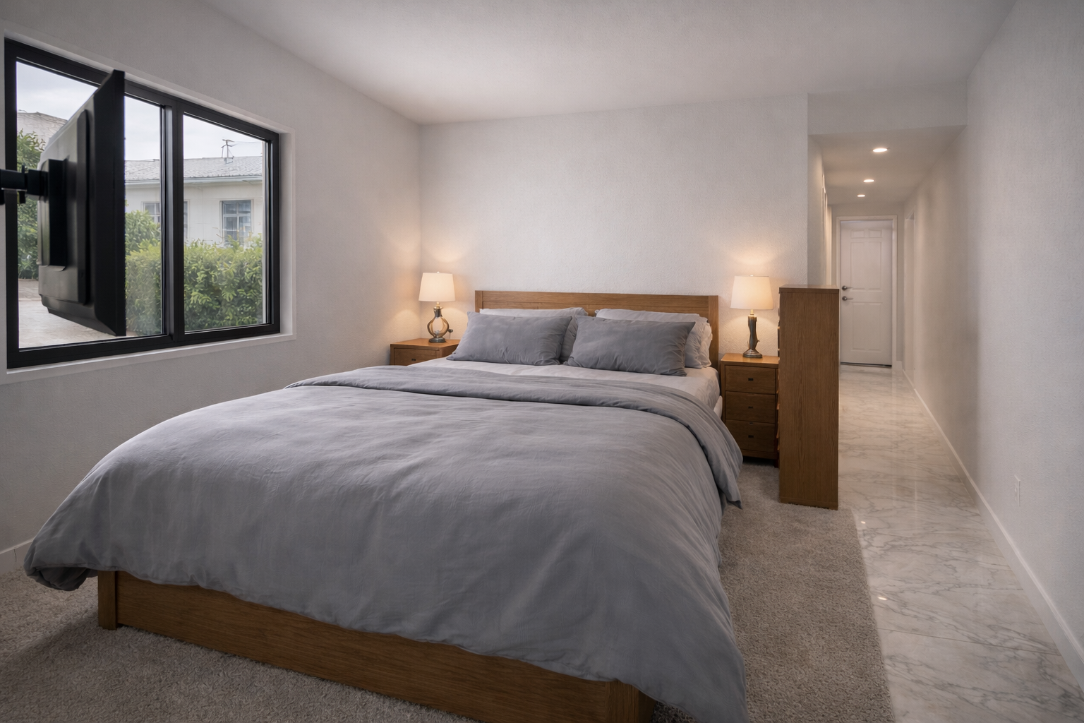 milgiora l immagine metti un quadro colorato sul letto la porta in fonso di legno e il mobile attaccato sul muro di destra