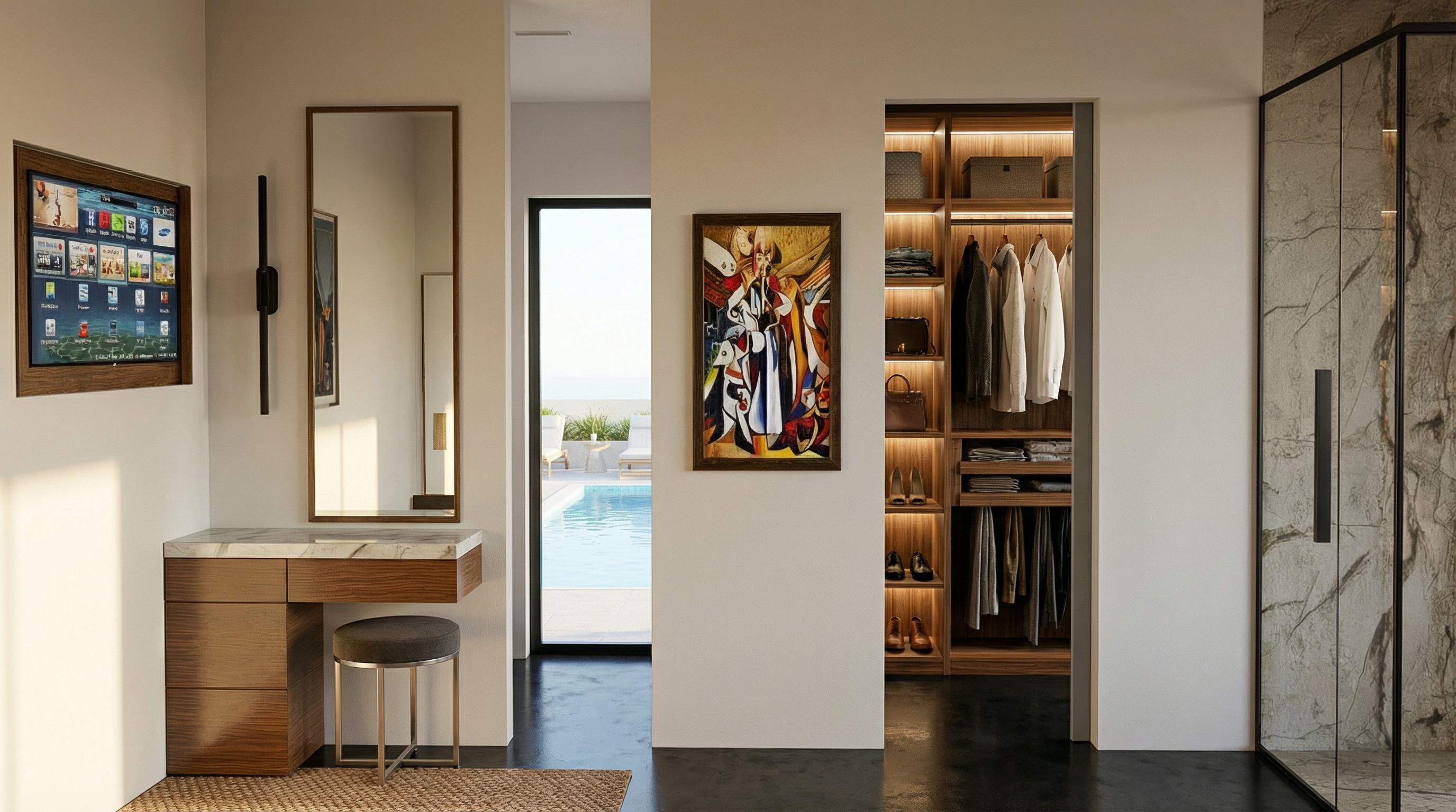 draw a modern plot plan use a style similar to famous contemporary architects the houses have flat roofs the street is paved pines and streetlights are next to the street use shades of gray