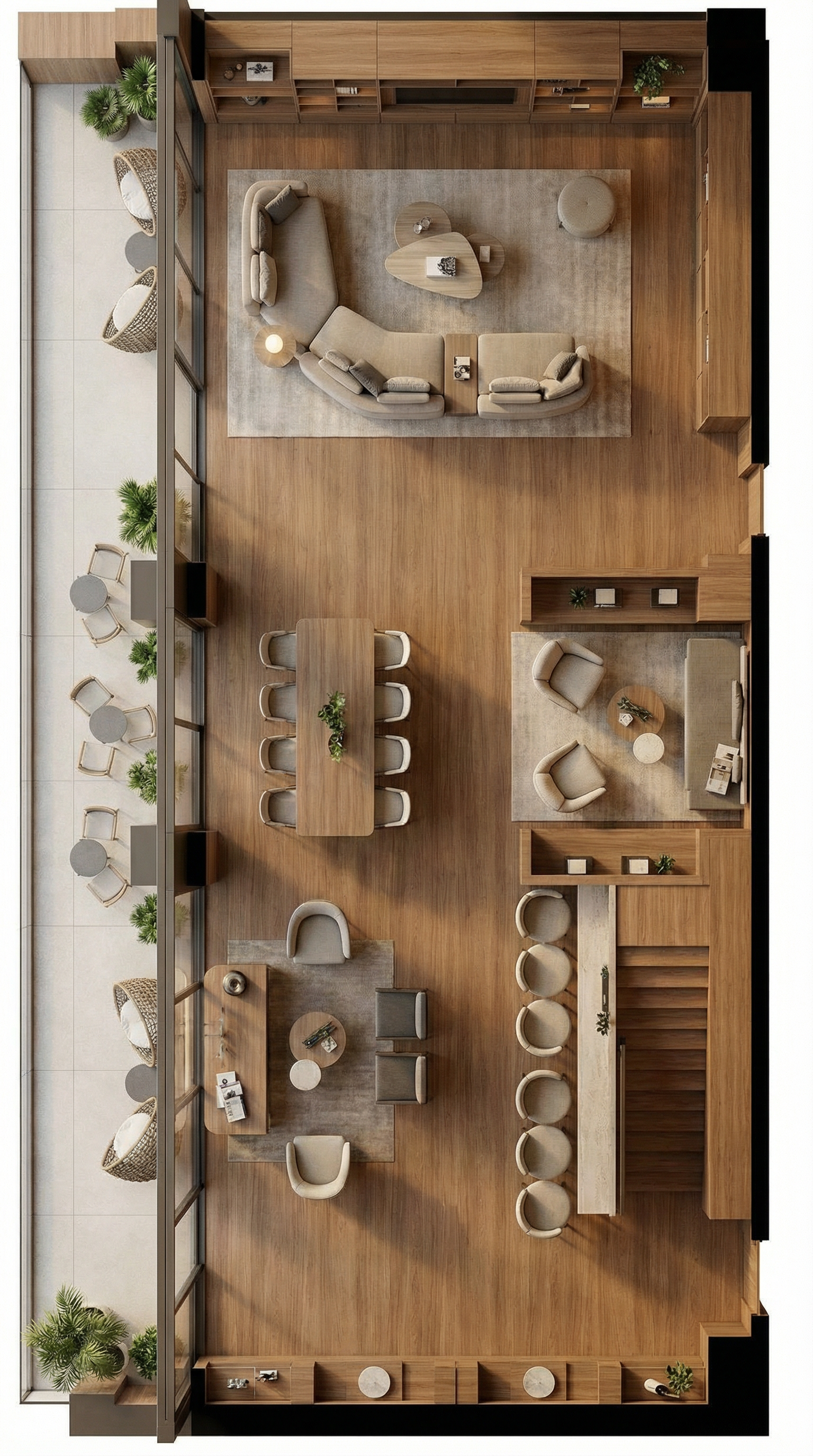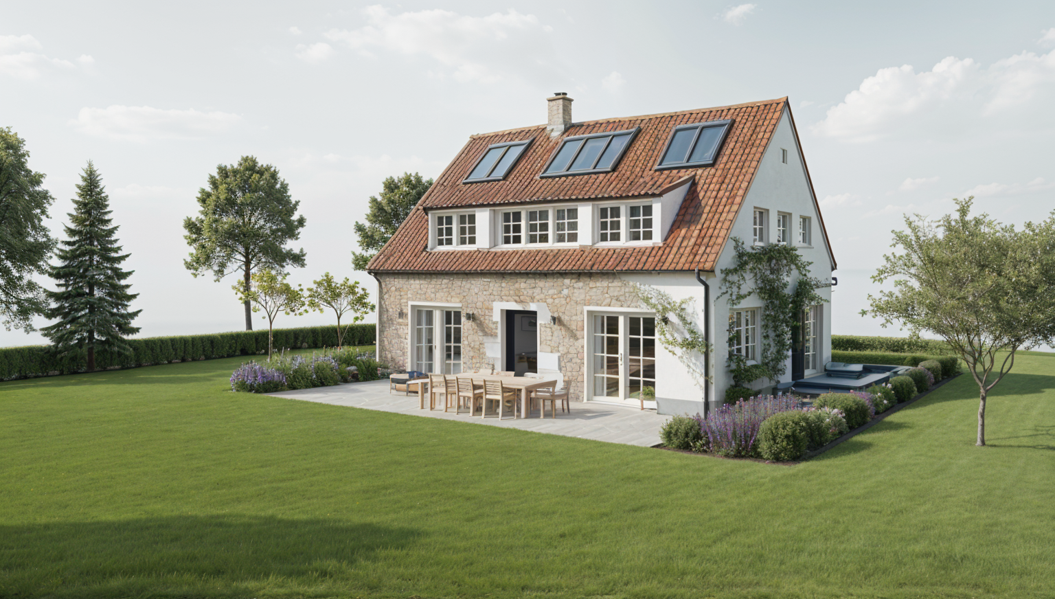 render a modern elegant house with a combination of textures and materials base the design on the blueprint layout provided use light alabaster board and batten siding for the main structure and natural beige brick textures for accent walls incorporate black window trims and door frames the roof should be a complimentary brown add a warm inviting light coming from the windows suggesting an afternoon setting surround the house with lush green grass and subtle landscaping in the front the overall atmosphere should exude warmth and sophistication
