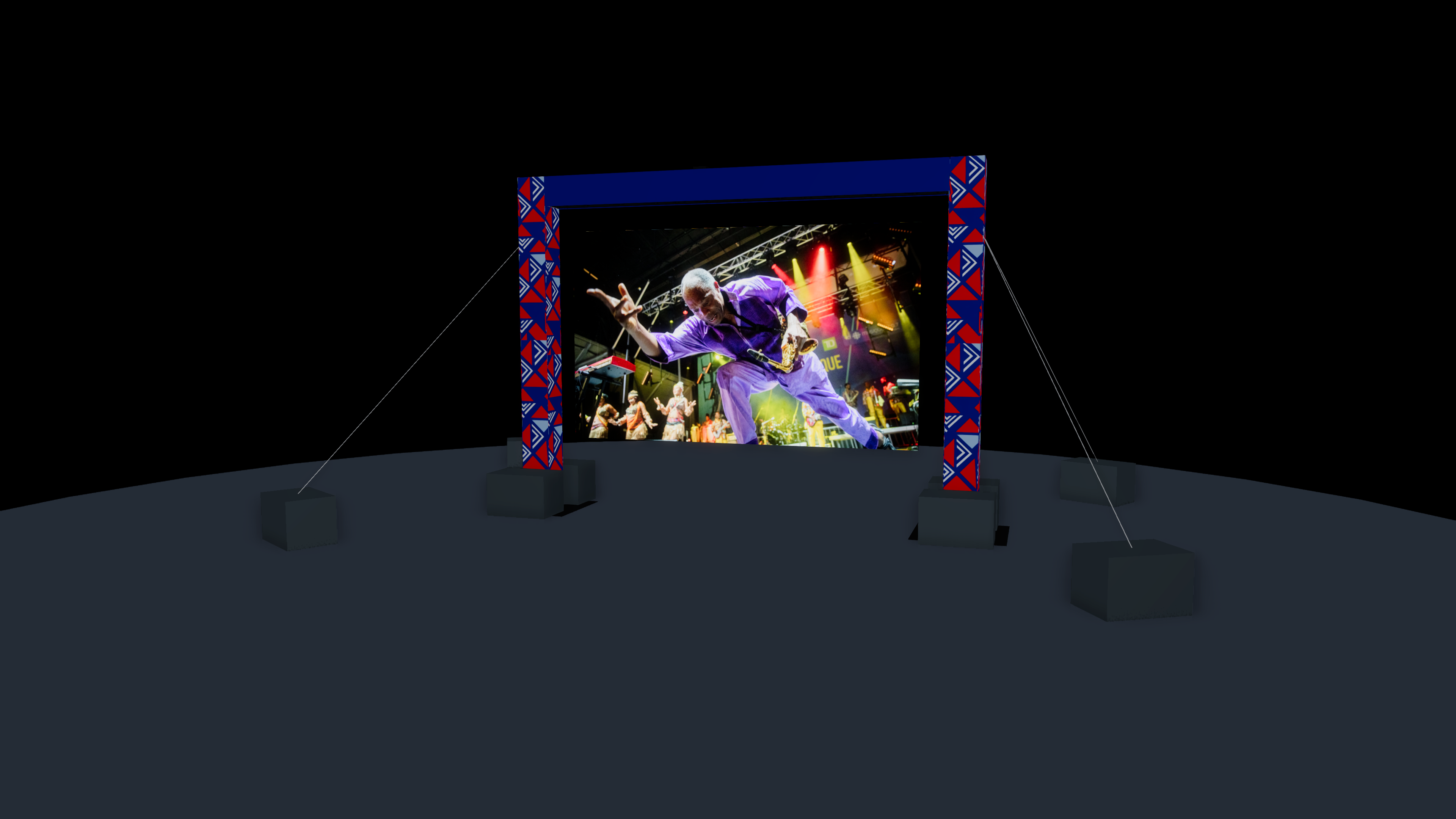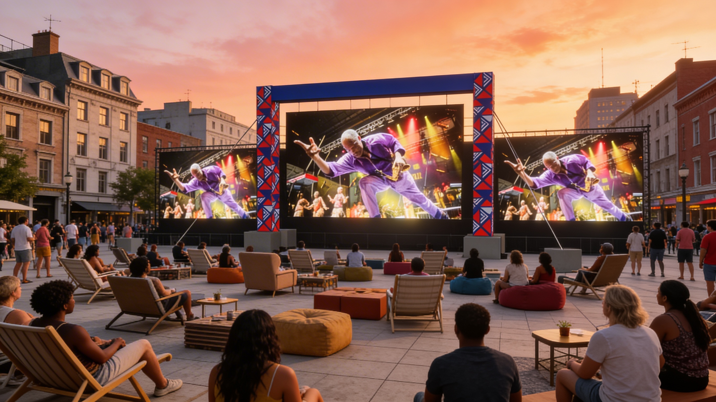 use the same render as reference and keep the existing led screens exactly as they are do not add any new screens do not duplicate screens do not change the number of screens correct the visual scale of the existing screens so they match real world proportions screen scale reference each led screen is 16 feet wide the screen should read as human scale urban installation the screen must not appear miniature people sitting nearby should help confirm the correct scale location place the scene on an open esplanade plaza inspired by the quartier des spectacles in montreal not in the middle of a street remove elements remove the circular stage platform at the bottom of the image leave an open plaza surface outdoor cinema area create a cozy outdoor viewing area in front of the screens seating comfortable lounge style seating mix of outdoor armchairs lounge chairs poufs and relaxed seating seating scattered naturally not in rows people more people to create a lively crowd people sitting standing chatting and watching the screens strong multicultural diversity reflecting montreal include people of african caribbean middle eastern asian latin american and european backgrounds balanced mix of skin tones mixed genders and ages casual summer clothing natural anatomy and relaxed body language atmosphere festival nuit d afrique vibe friendly cultural gathering relaxed outdoor screening event environment urban plaza inspired by quartier des spectacles montreal style buildings around the space lighting sunset golden hour warm sky with orange and pink tones soft natural light with subtle screen glow style realistic natural crowd behavior relaxed festival atmosphere goal create a busy outdoor cinema lounge scene on a plaza in the quartier des spectacles with a large multicultural audience watching the existing led screens correctly scaled at 16 feet wide during a sunset nuit d afrique festival moment