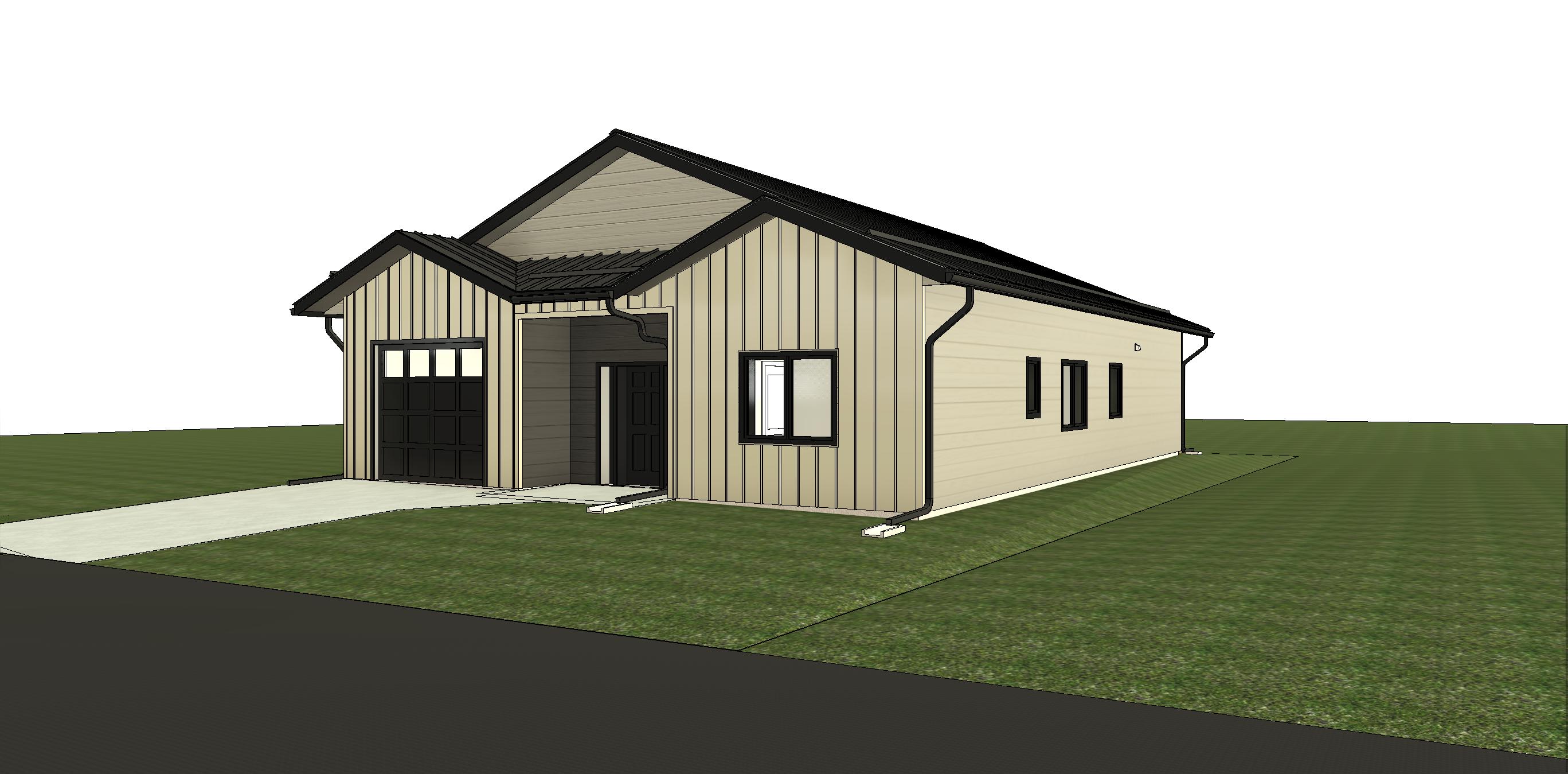a modern suburban rancher with a combination of lp smartside horizontal lap siding in timberland suede on the upper roof gable as shown lp smartside board and batten in timberland suede as shown and lp smartside horizontal lap siding in bonsai black in the front door entry and side walls as shown black garage door with windows across the top front door is black with glass sidelights as shown black standing seam metal roofing black fascia and black metal soffit retain the exact structure window arrangement rooflines height and proportions exactly as shown in the reference image add a smooth concrete front driveway extending toward the house garage door and a walkway from the driveway to the front door bronze tinted reflective windows enhance materials and colors keep exact window structure arrangement rooflines and proportions exactly as shown in the reference image soft interior lighting inside the home creates warmth the home around the property is a few sparse mixed evergreens and hardwoods add some typical yard landscaping such as shrubs flowers rocks etc place the sun out of view casting soft rays and subtle dappled highlights across the front of the home create ultra realistic lighting crisp shadows detailed textures in the wood and glass reflections and a vibrant clear sky with light atmospheric depth render in hyper realistic architectural visualization quality 8k resolution do not change the view angle