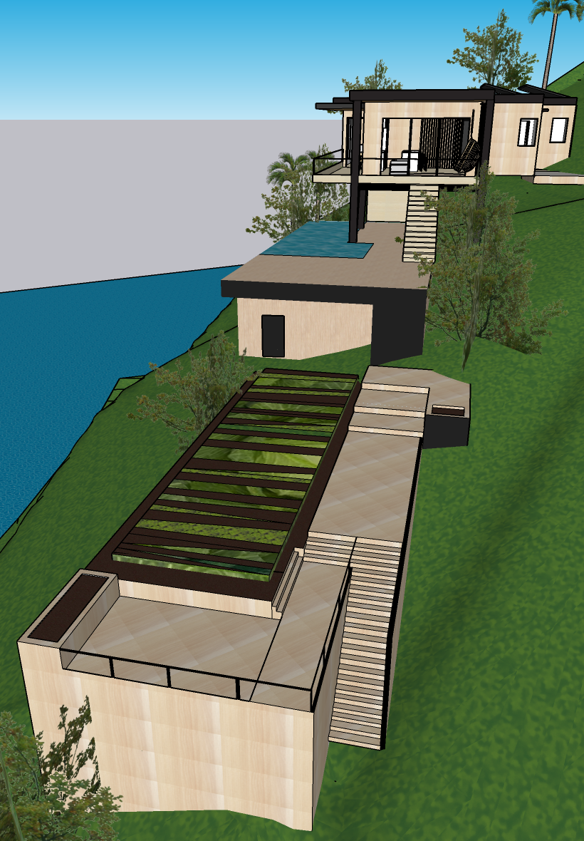 exterior shot render a modern hillside house with terraces overlooking a serene blue ocean use warm beige and light brown tones for the house exterior with sleek black accents on railings and frames render the lowest terrace topped with a vegetabl middle terrace with a pool surround with lush green grass and lively palm trees surrounding the building enhancing a tropical vibe add realistic textures to the foliage and structure set against a clear bright azure sky creating a tranquil inviting atmosphere