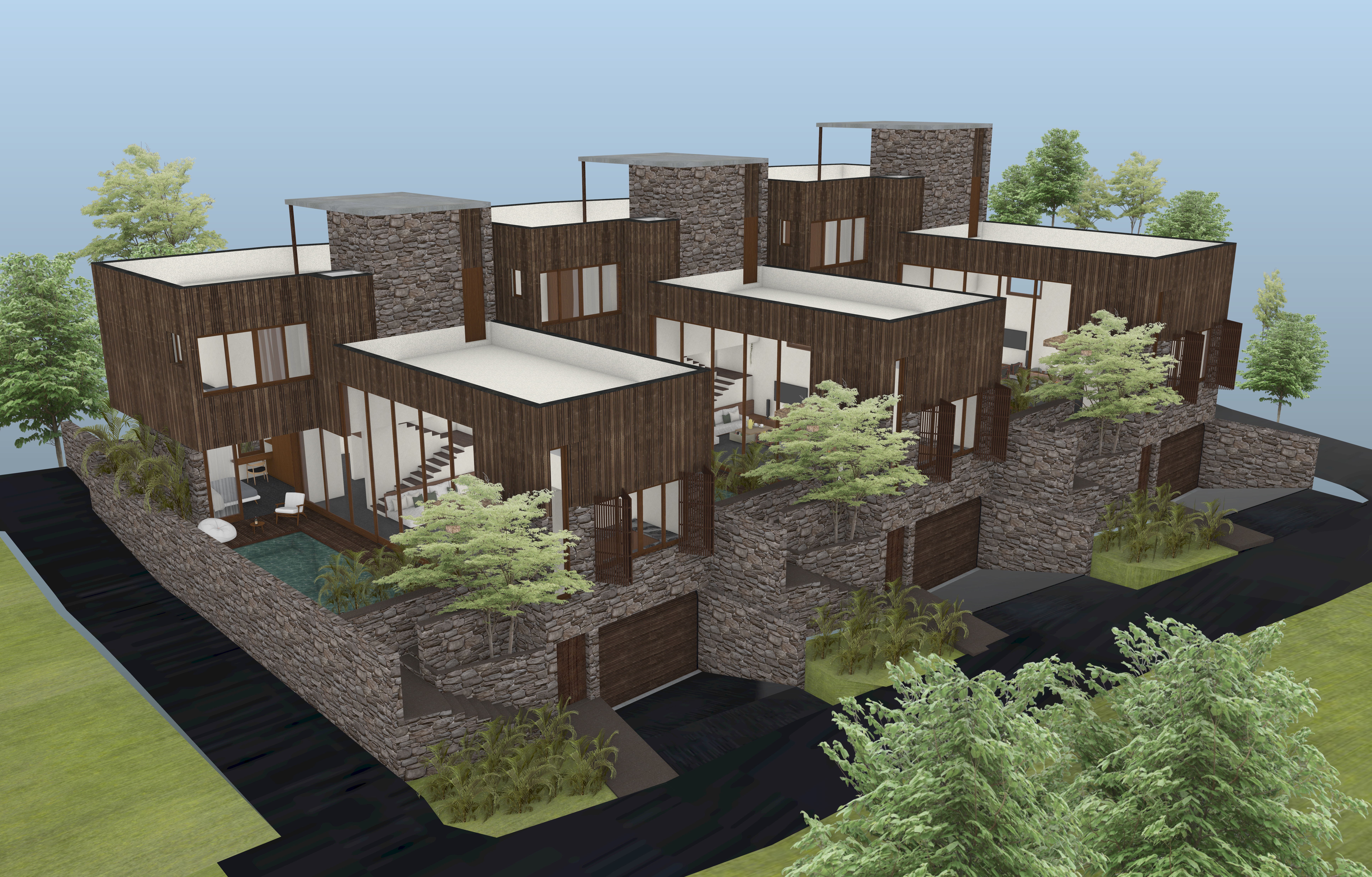 ultra realistic architectural photograph aerial view of 3 row villas in modern design in tropical setting background to be very near and not expansive materials to be kept exact background to be blue sky with 30 cloud cover scene is neutrally warm lit no drastic shadows the foreground has an asphalt road extending left and right with naturally fading edges with the landscape and tree foliage merging with the lower edge of the frame