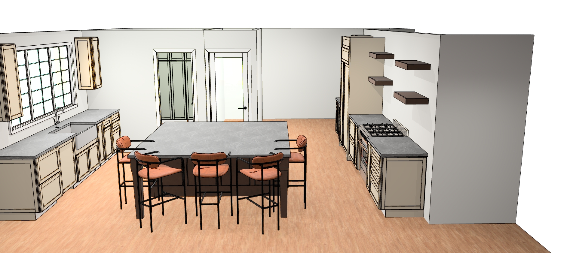 make countertops taj mahal quartzite add 2 large pendants over the island add a warm white hood with brass straps over the range