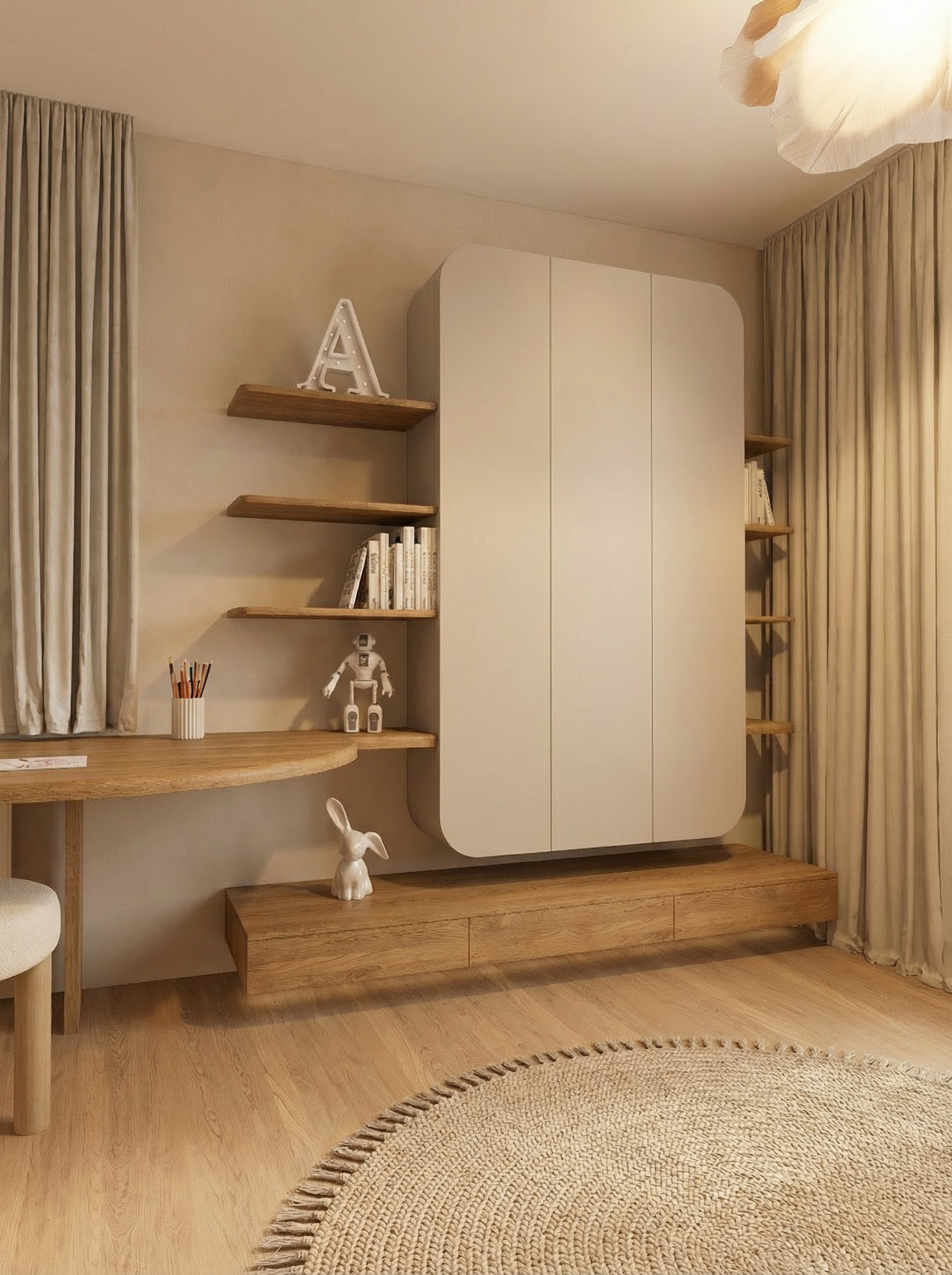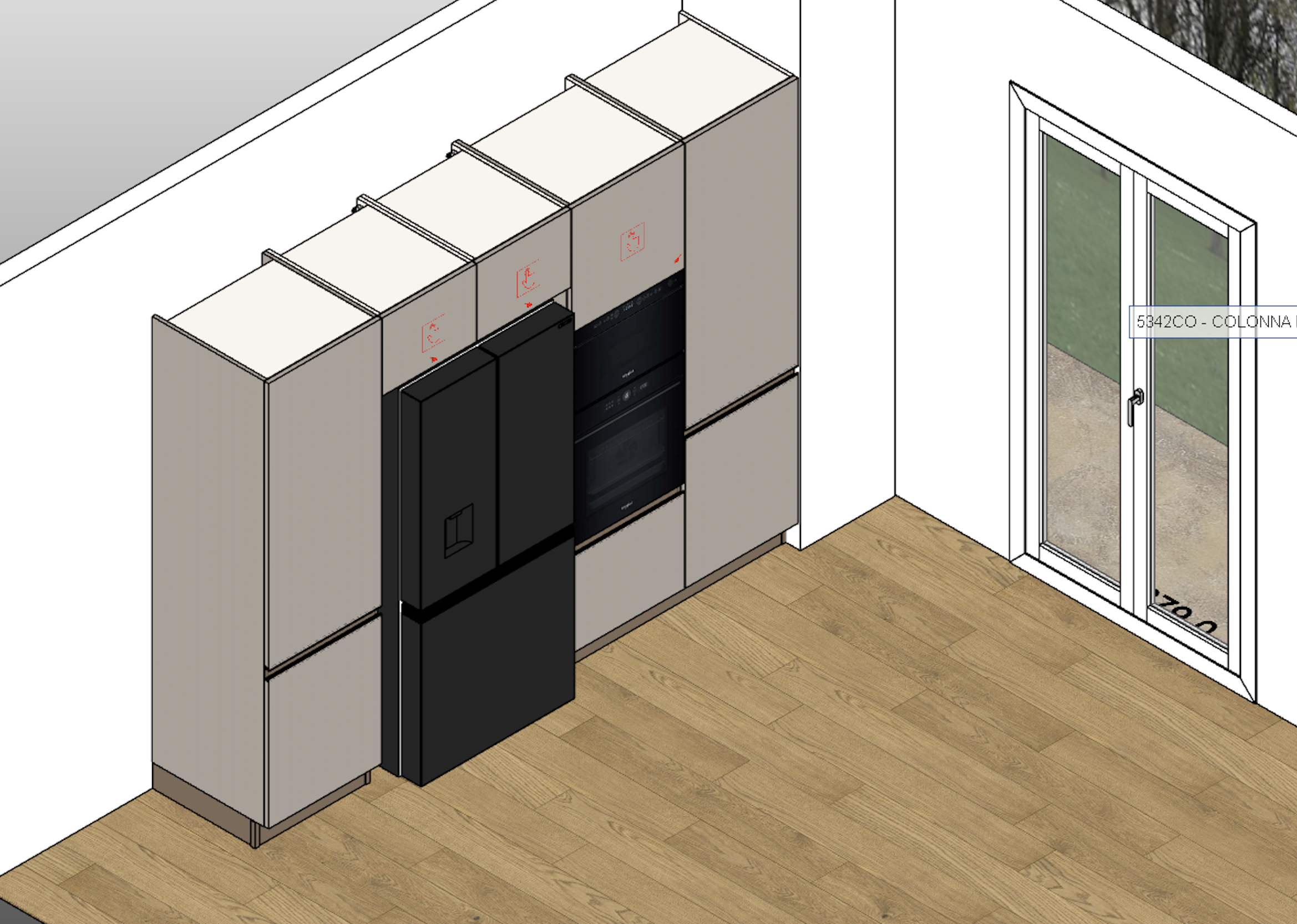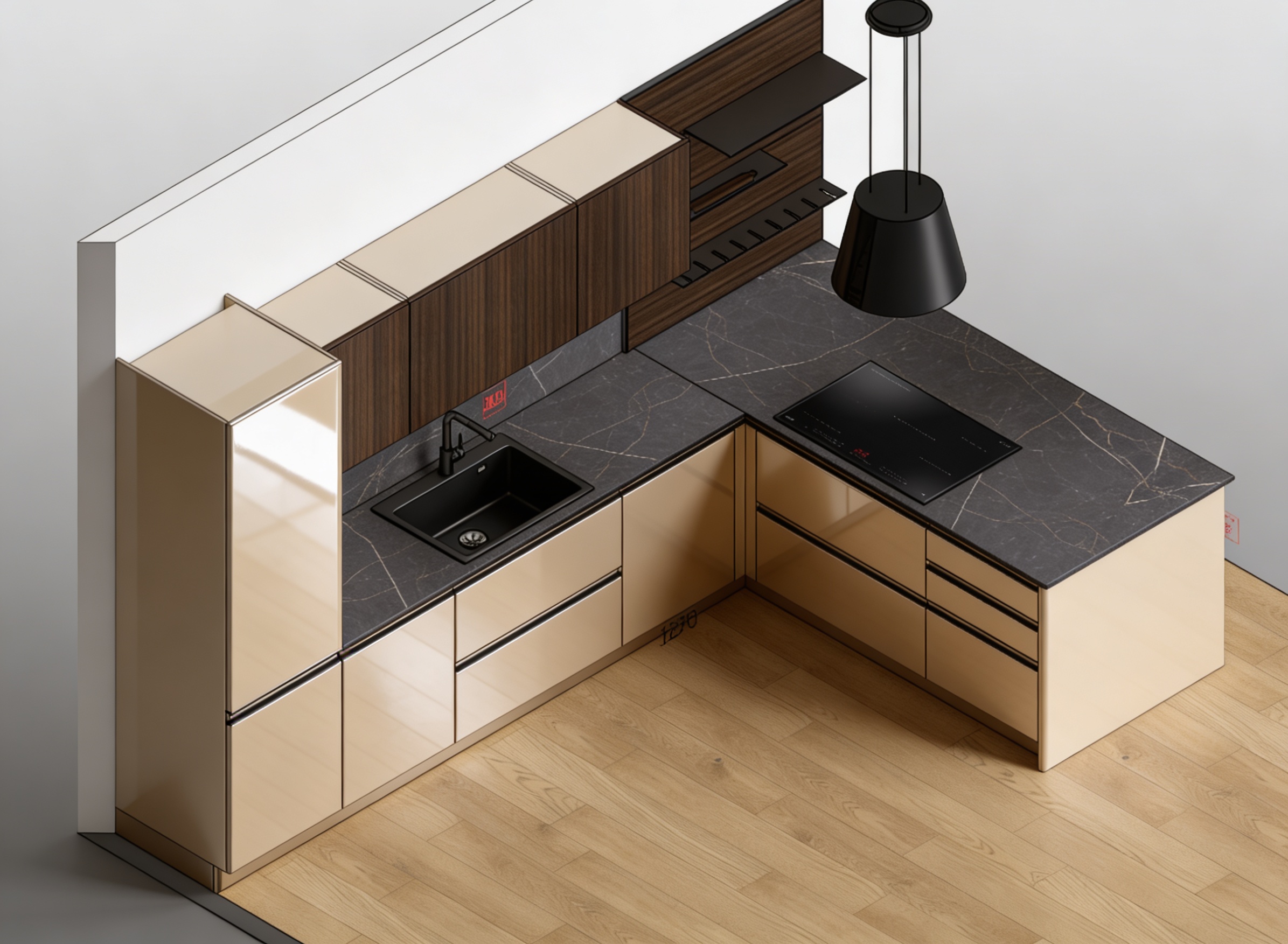 mi puoi renderizzare questa scena rendendola in stile caldo con superfici laccate e riflettenti con colori uniformi per i pensili e la colonna sul colore tortora