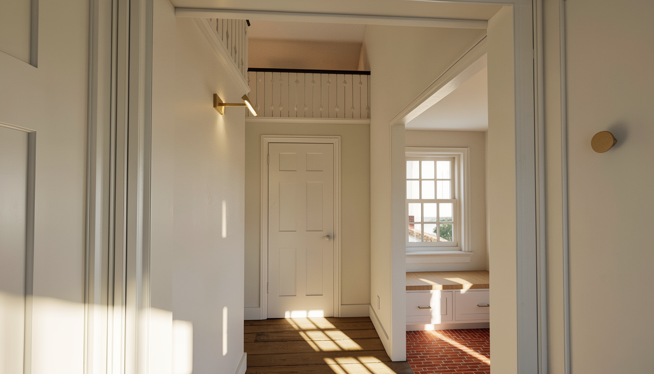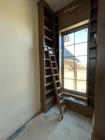 do not change the cabinets in any way preserve the exact cabinet colors materials finishes dimensions door and drawer styles hardware spacing alignment and all geometry exactly as shown do not alter the countertop shape backsplash appliances flooring lighting fixtures or wall structure only remove the construction materials clutter and mess from the scene clean the room and make it look finished and staged add a few simple tasteful home accessories appropriate for the style of the space but do not add or remove any furniture windows or architectural elements maintain the original lighting direction and realism enhance clarity and polish the photo while keeping the cabinetry and room design completely unchanged do not alter the lighting to keep the cabinet colors as they are in the image add new flooring turn on the light sconce with a picture below add a view out the window stage all of the shelves for a luxurious library