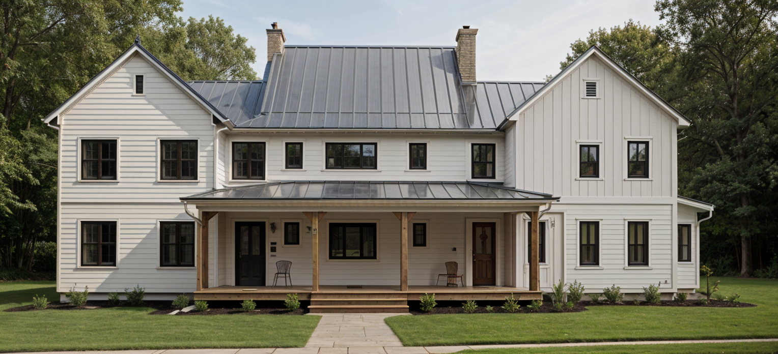 trees in background white board and batten metal roof black windows