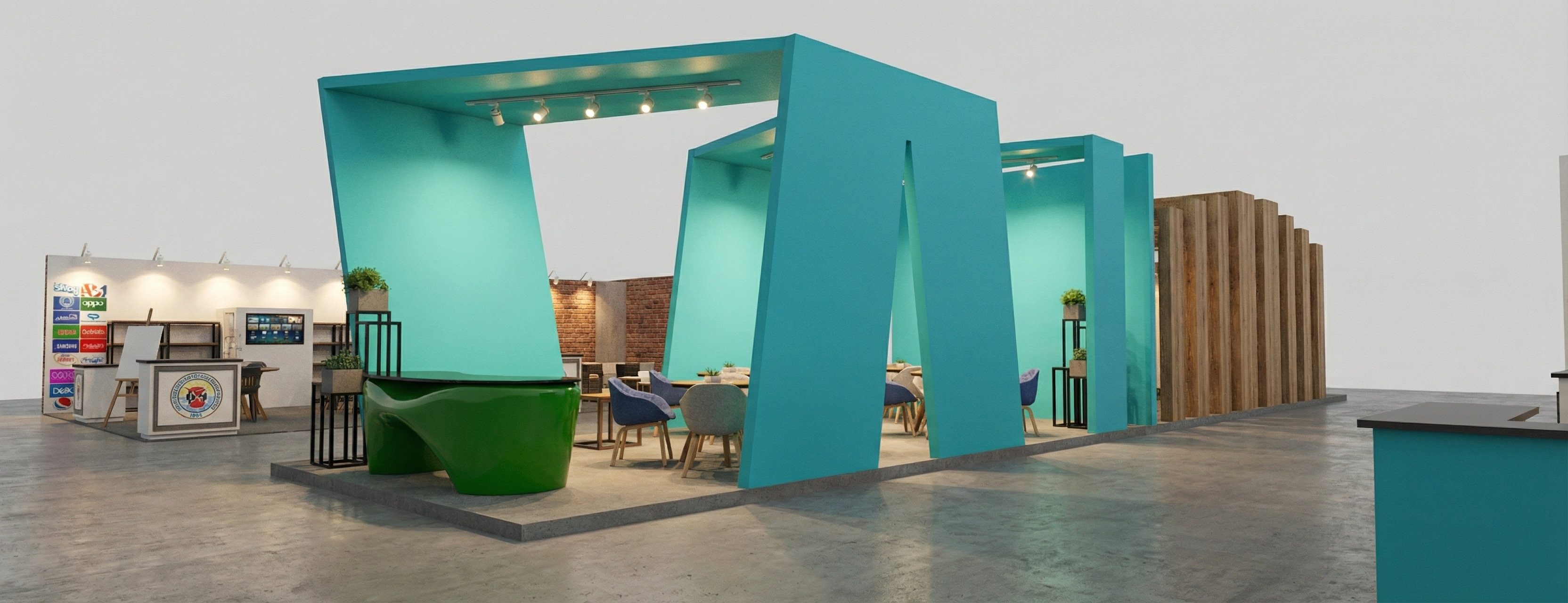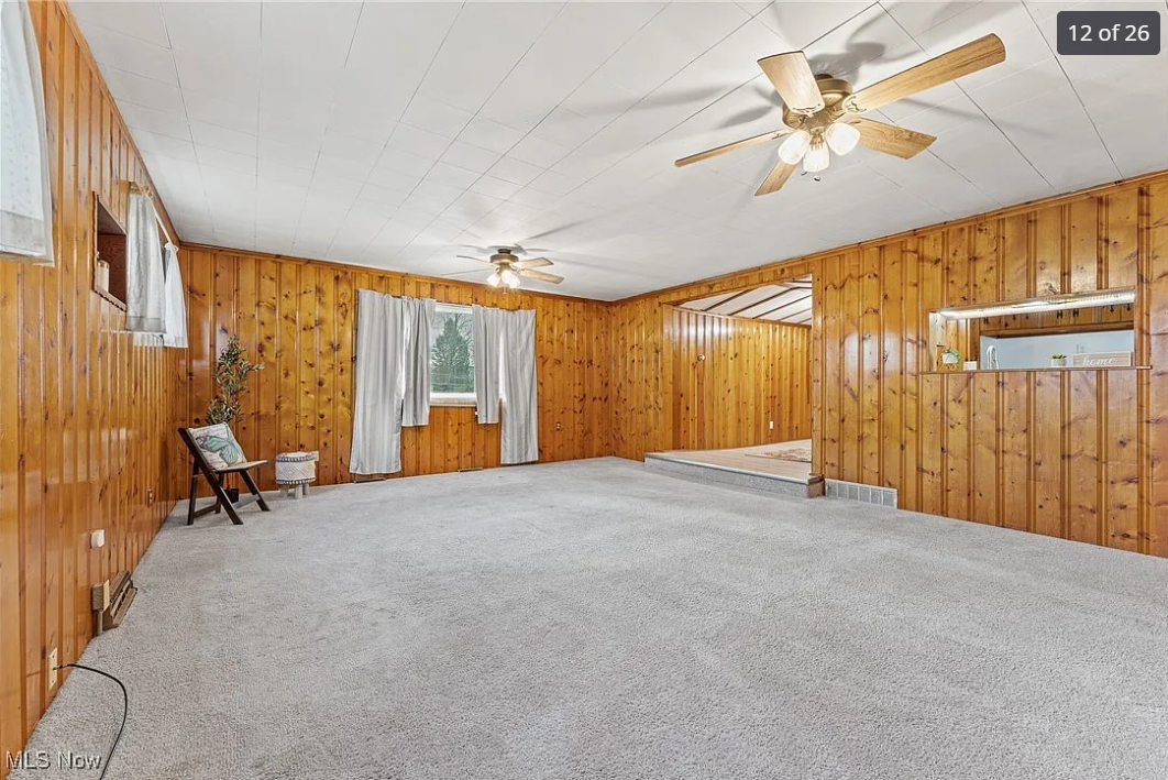 utilizing a lime green turquoise blue and off white color scheme update this living room to have a mid century modern style populate the room with a walnut tv stand a switchblade coffee table white vinyl sofa turquoise blue felt accent chair and a large house plant maintain the shiplap wall but put chair rail around the walls and paint the bottom half a lime or turquoise color do not change the geometry of the room