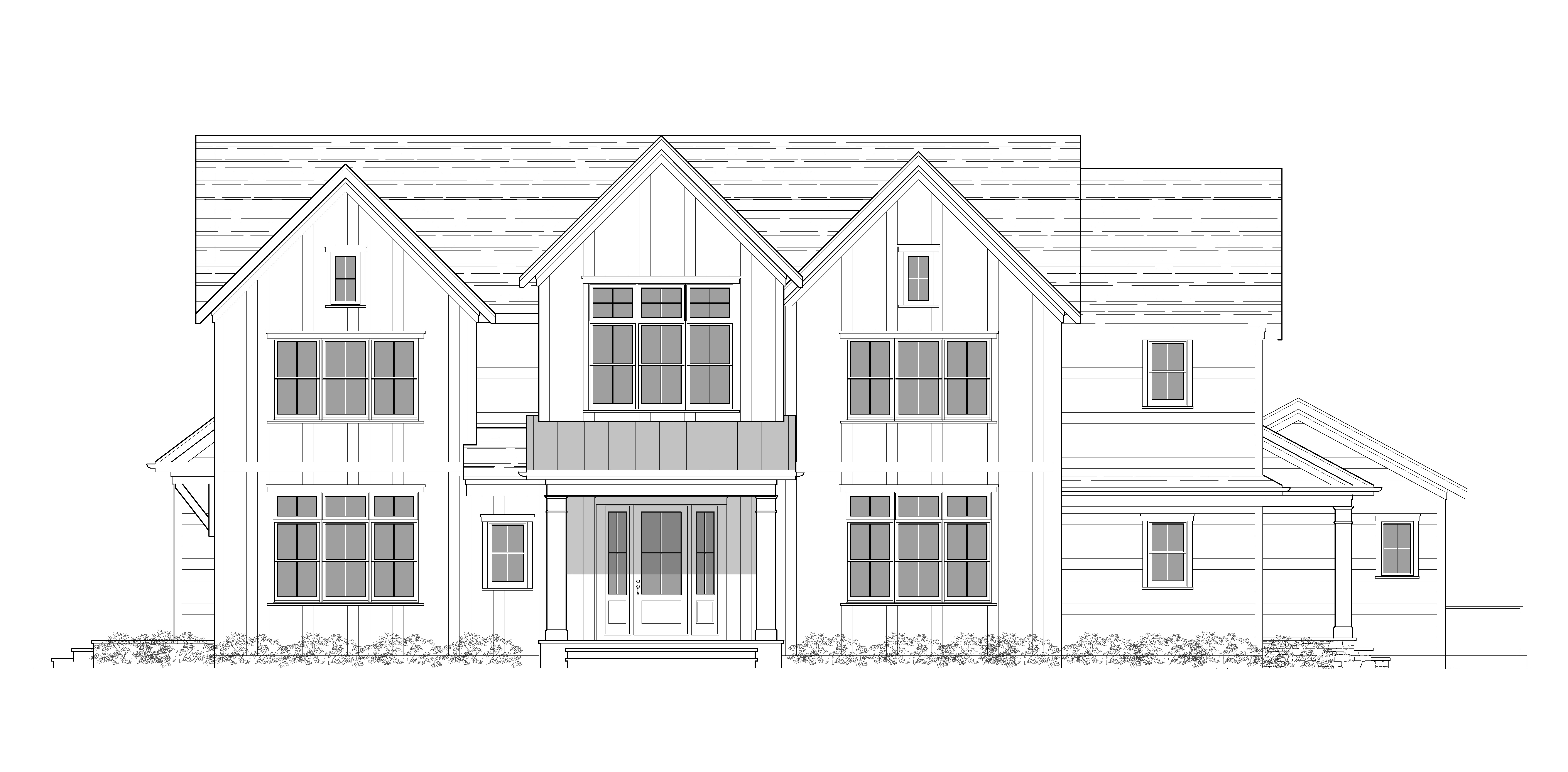 black charcoal colored asphalt roofing white siding white windows background vineyard in the distance leading to a body of water at the horizon far away