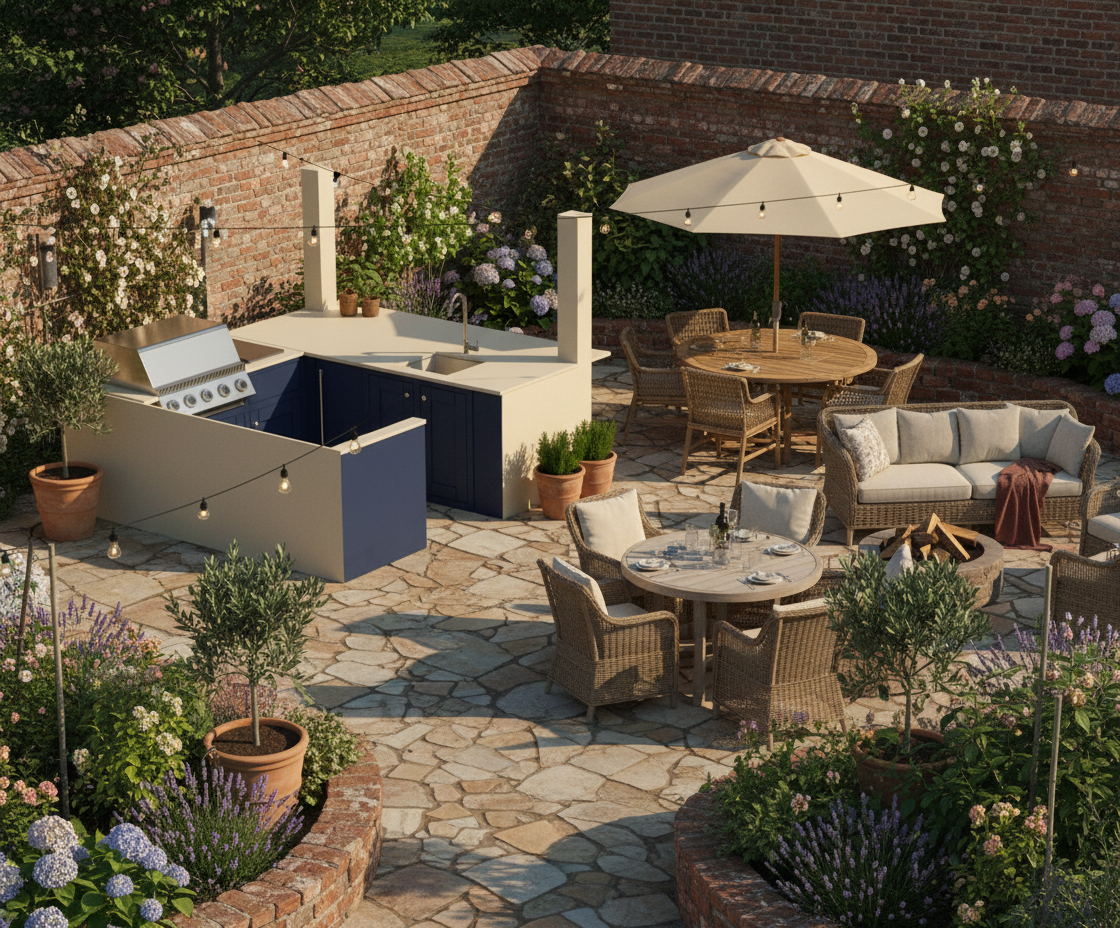 take this 2d drawing and remove all the labels numbers words and dimension lines to create a photo realistic interior kitchen rendering of this exact space do not change anything about the cabinet size count or placement use white cabinets white rectangular subway tile backsplash gray cement quartz countertops whirlpool stainless steel appliances torlys lexington landen oak laminate flooring and nickel cabinet pulls