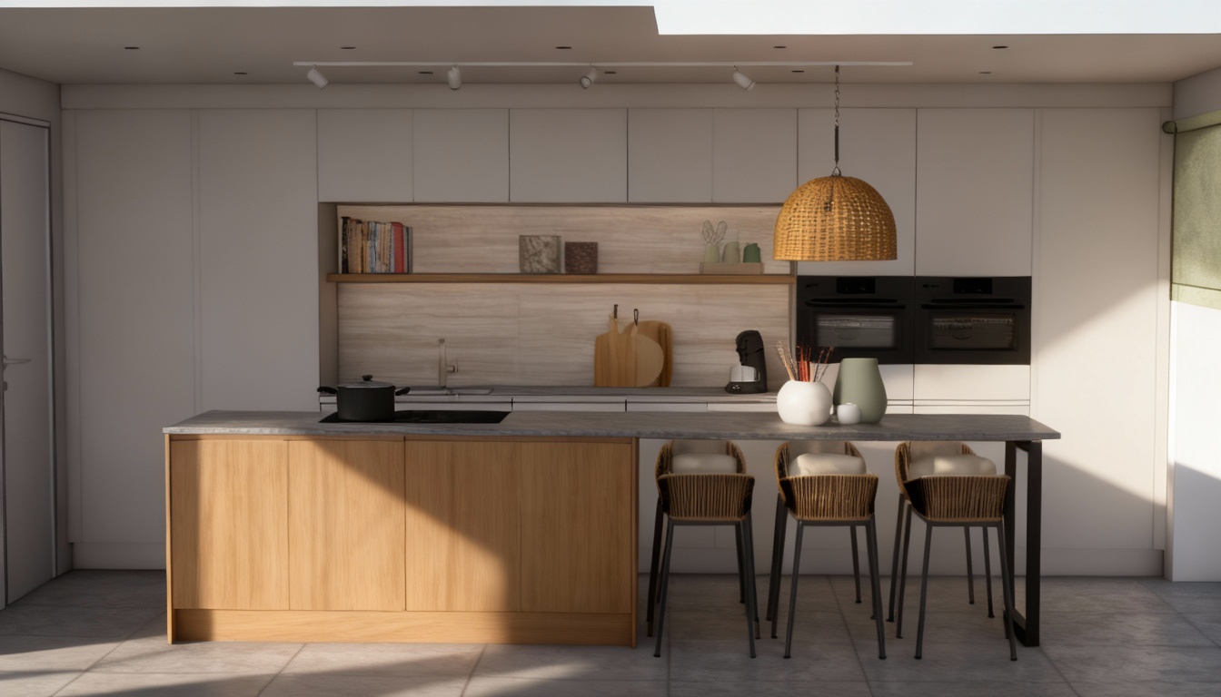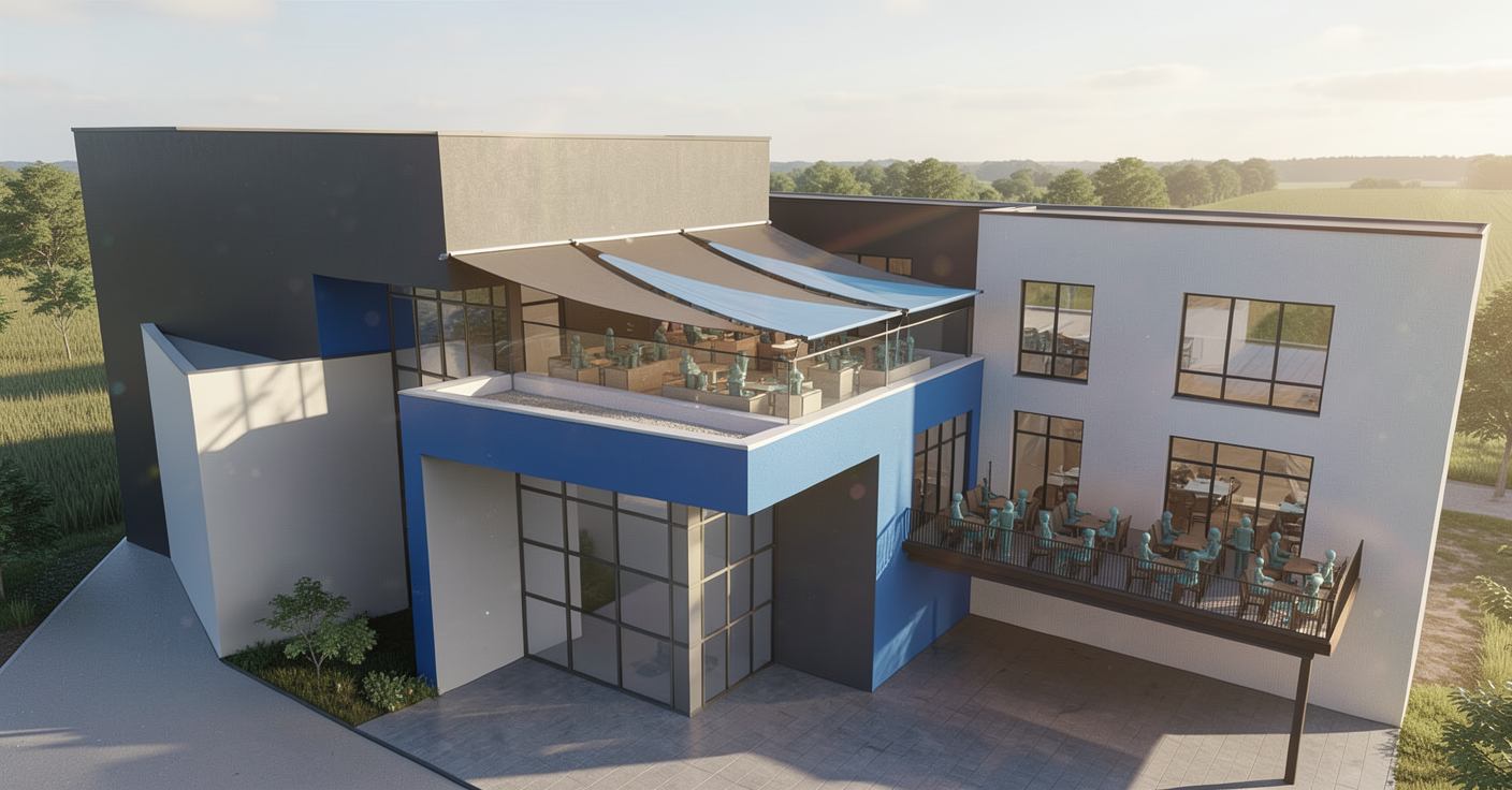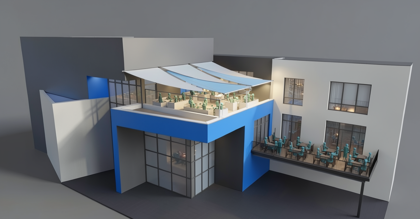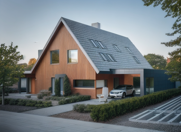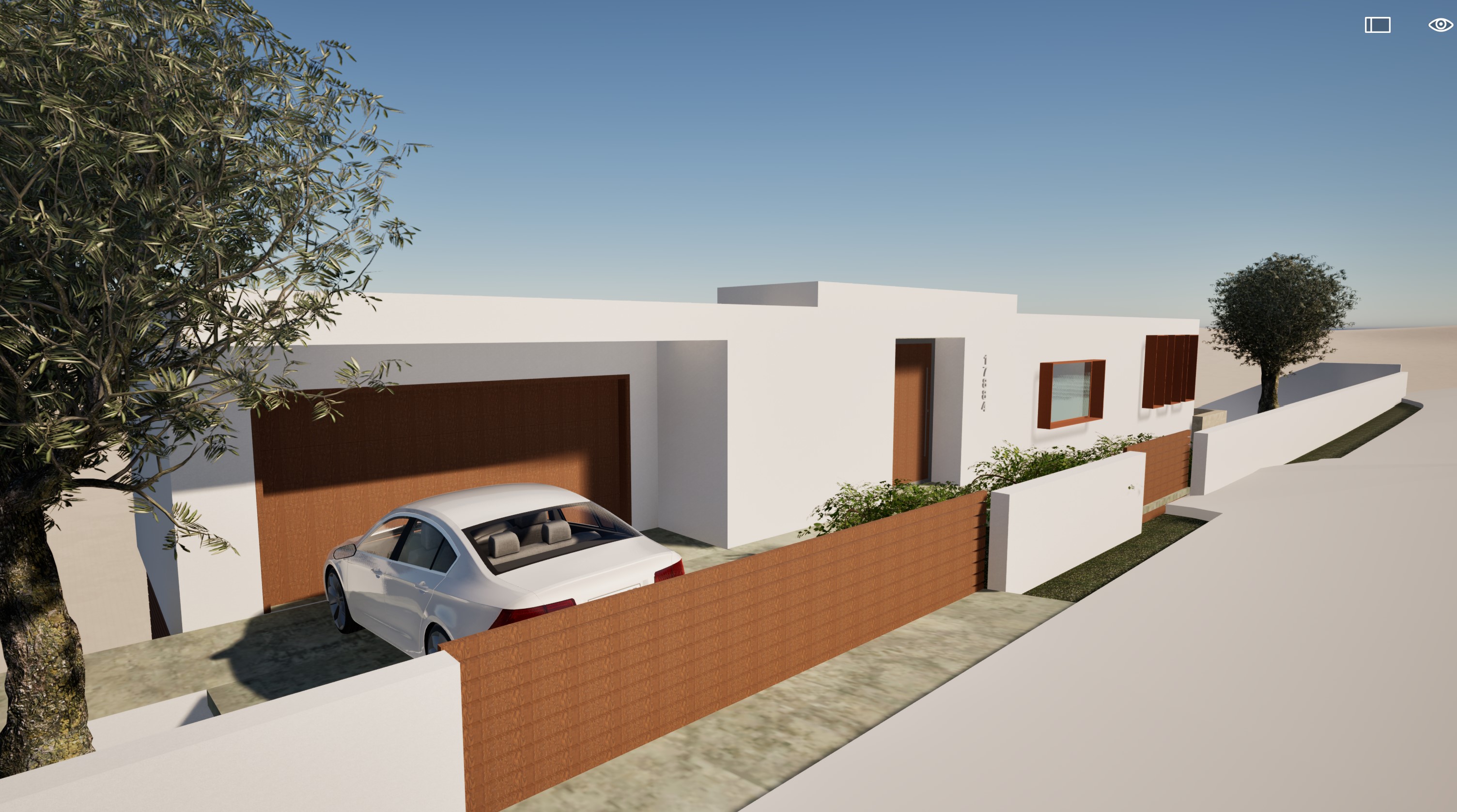 a modern house in pacific palisades ca overlooking the pacific ocean with smooth white plaster finish corten steel window trims view from the street with mature olive trees with wide branches and california native bushes and houses surrounding the building california sunny clear blue skies