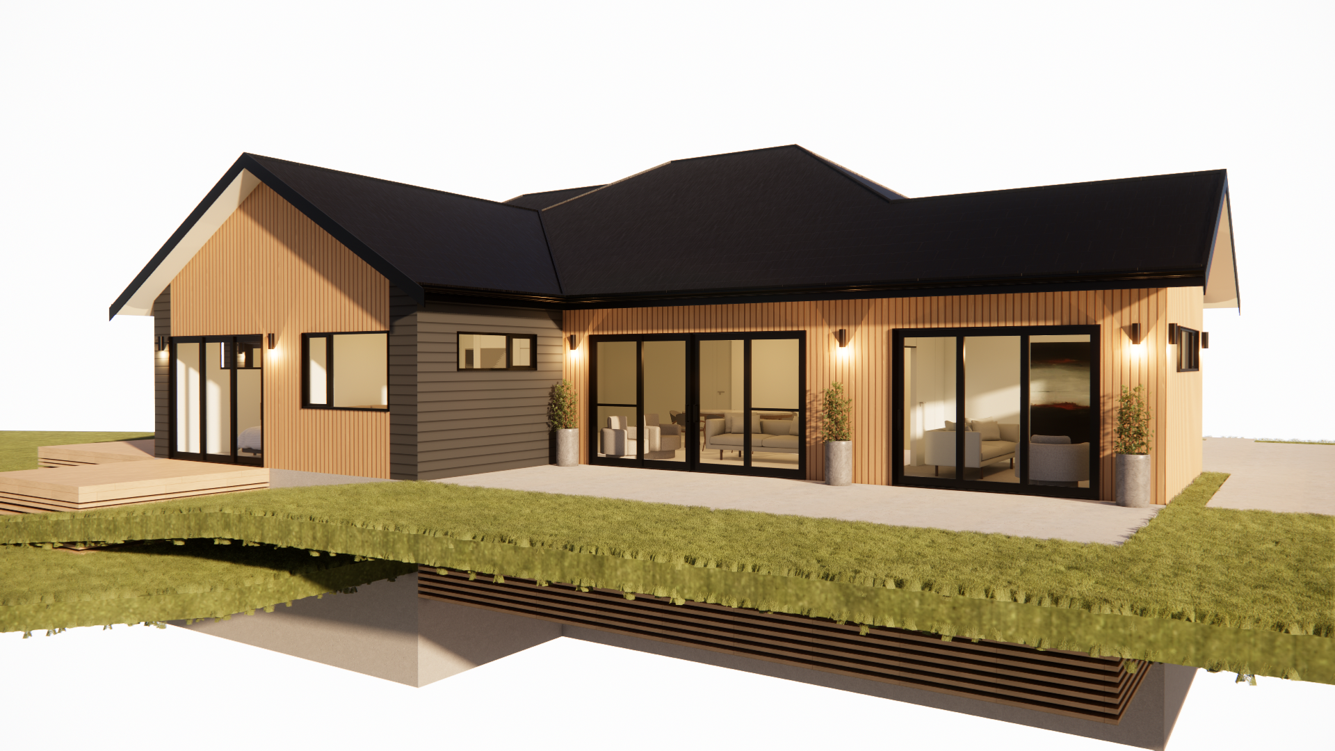 front on view of house 5m off ground vertical timber cladding and horizontal weatherboard landscaping to side of house fencing to both sides of house one person inside a sunny day bush to sides large tree in foreground to right side add furniture to outdoor areas