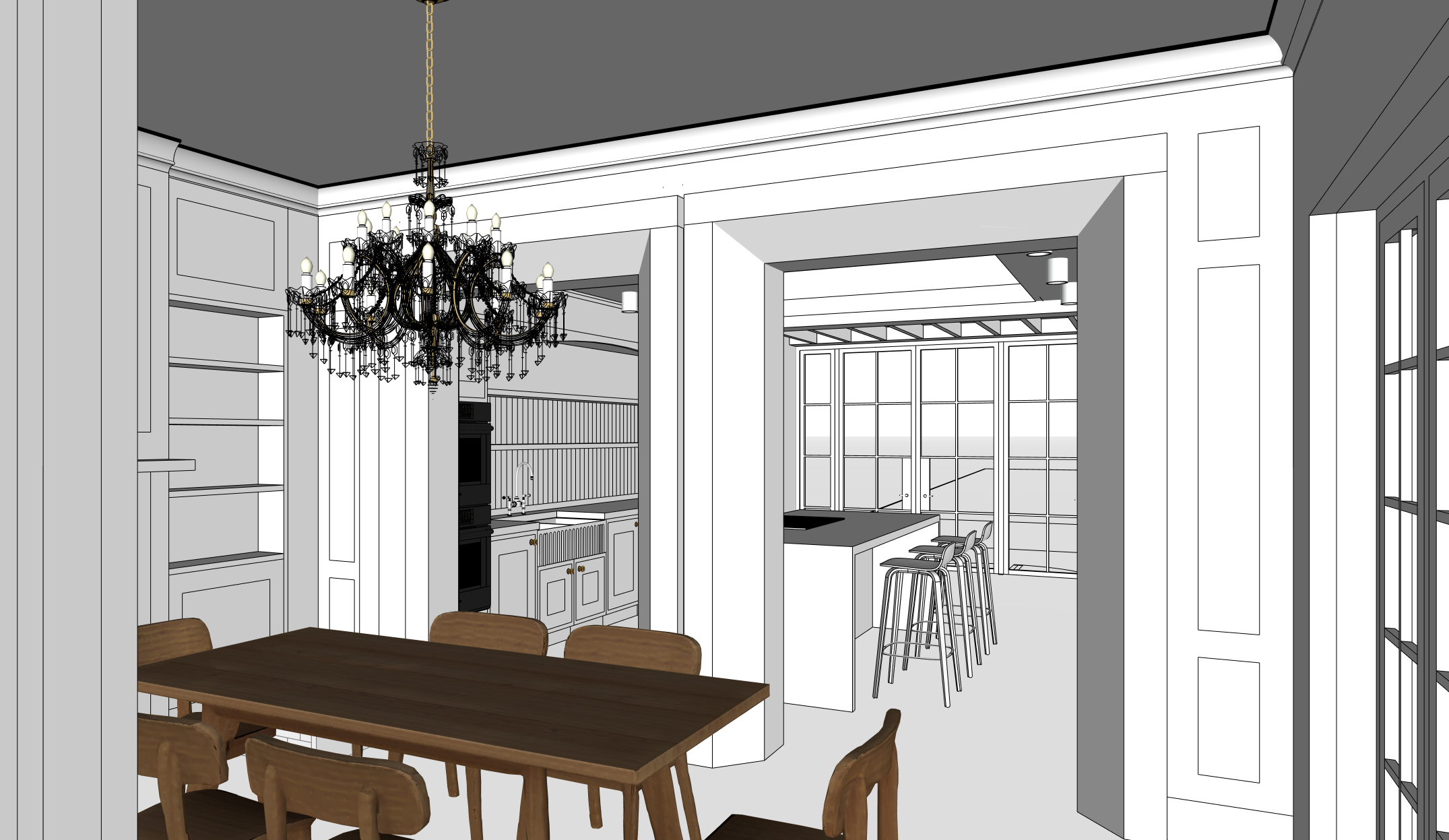 transform the sketch into a beautiful render in style of the reference image in the same colours and finishes as the reference image without changing the geometry and proportions of any objects in the sketch keeping the 2 square headed openings and the panelling as per the sketch drawing