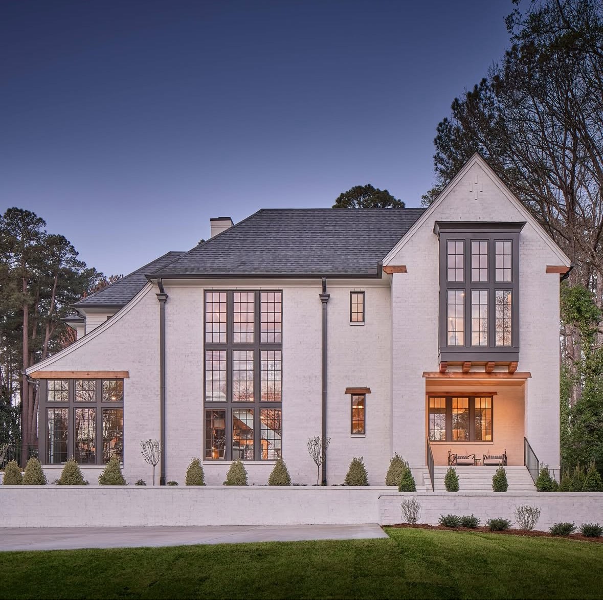 exterior shot white brick exterior with dark grey windows and front door