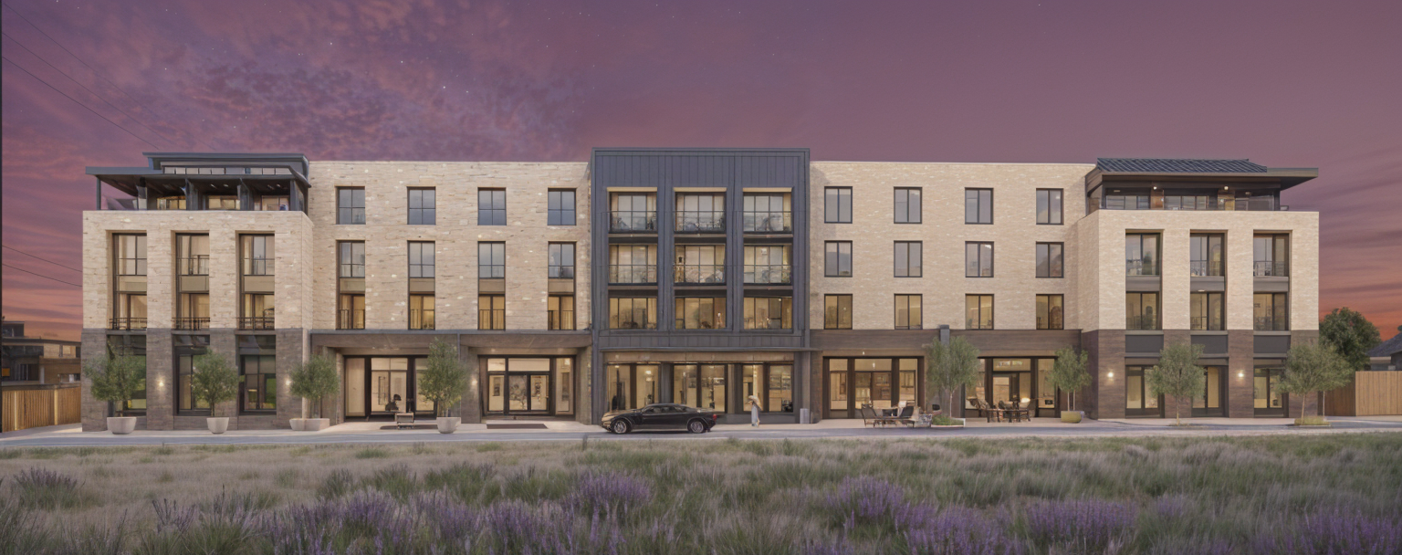 a industrial hotel in fort worth texas plaster and stone walls steel framed windows strong geometric forms rooftop terraces with greenery symmetrical fa ade and dramatic nighttime architectural lighting western traditional design architecture