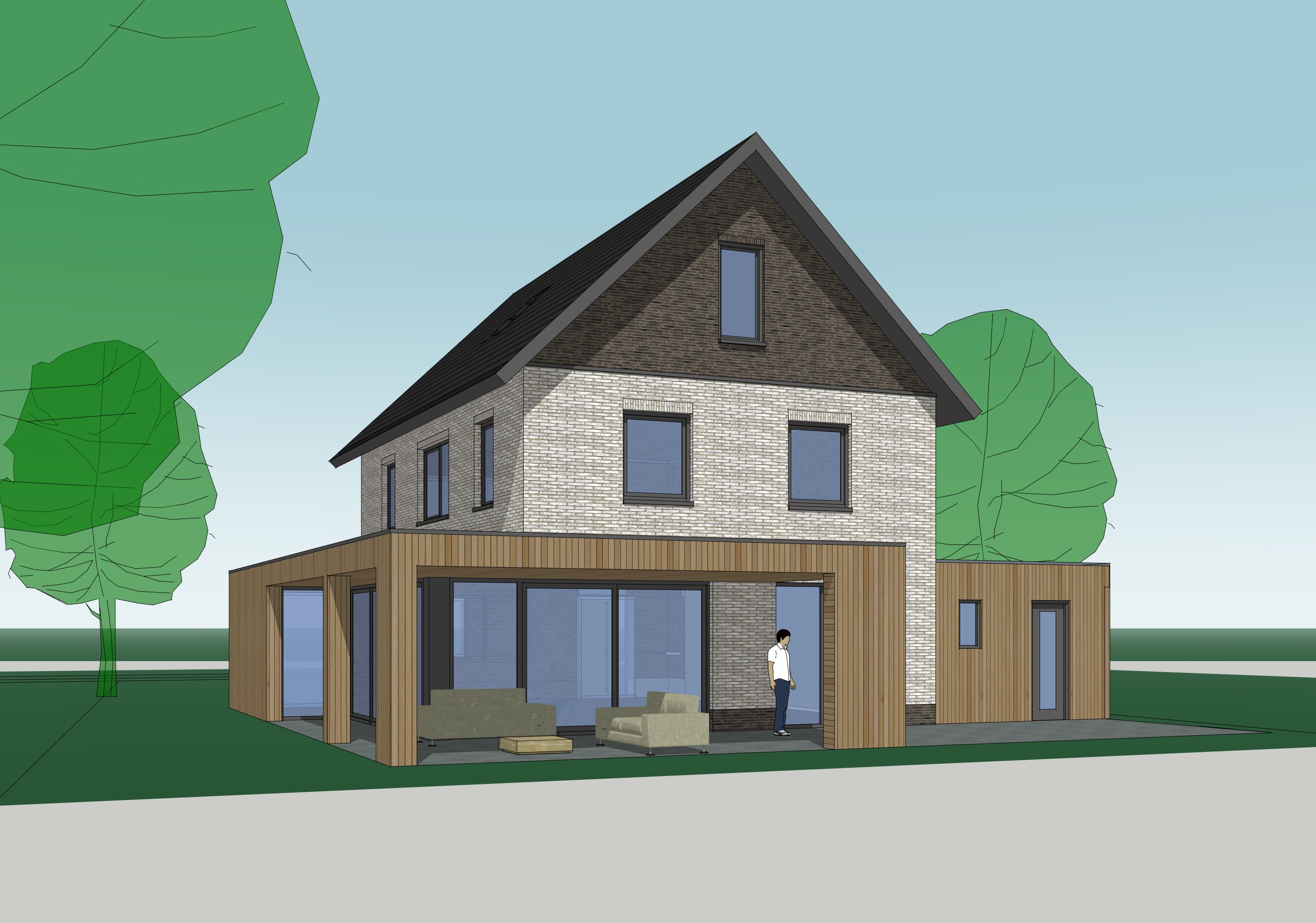 add trees bushes and flowers and some people around the house and in the garden and on the terrace the weather is sunny with a few clouds keep the materials and clours of the house exactly the same as in the original the grey area in the front is garden and is green and lush the sun illuminates the front facade and makes the picture feel warm and nice