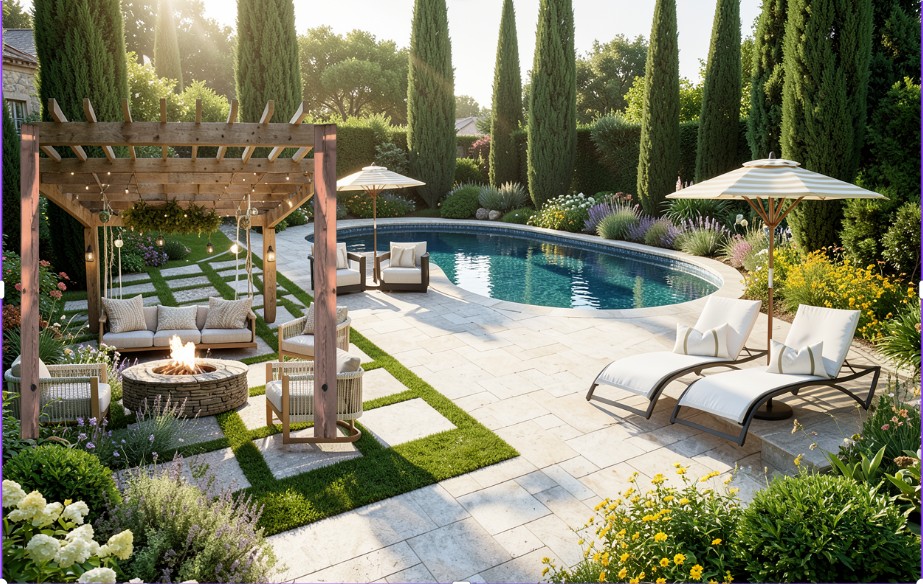 update this render by removing the turf and pavers and extending the travertine pool patio under the pergola and firepit area