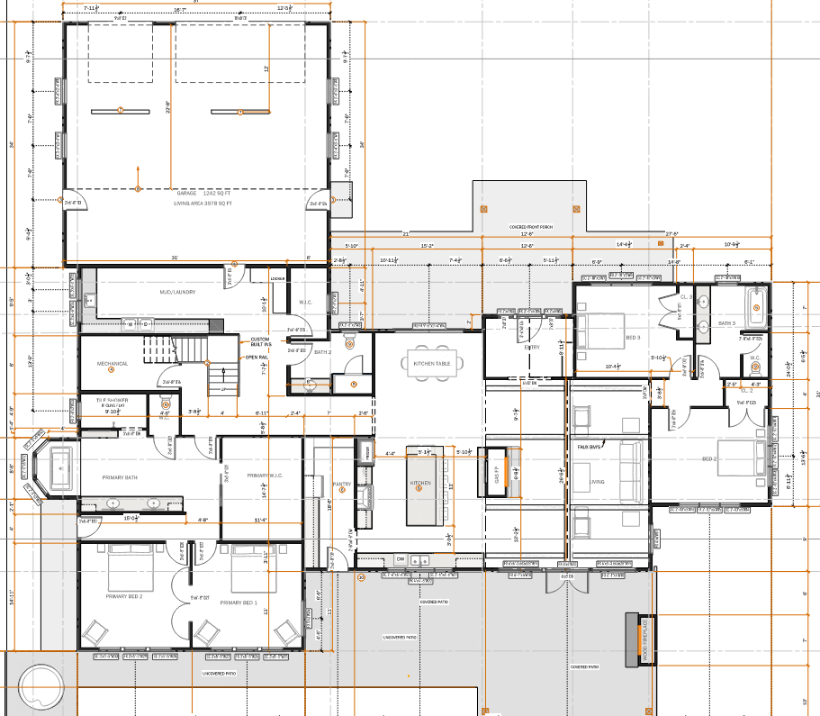 convert this floor plan into a realistic isometric 3d view of a full house show the space from an elevated angle with furniture walls and details visible create a beautifully rendered floor plan of a spacious modern house use a soothing palette with soft greys and whites for the walls and layout lines highlight key areas like primary bath kitchen and living using subtle shades of pastel blues and greens render the garage area with warm beige tones to suggest coziness add wooden textures for kitchen table and entry with rich dark brown hues use diffused natural lighting for an inviting atmosphere casting gentle shadows to enhance depth and dimension use the same furniture as shows on the plan do not change the orientation of the floorplan