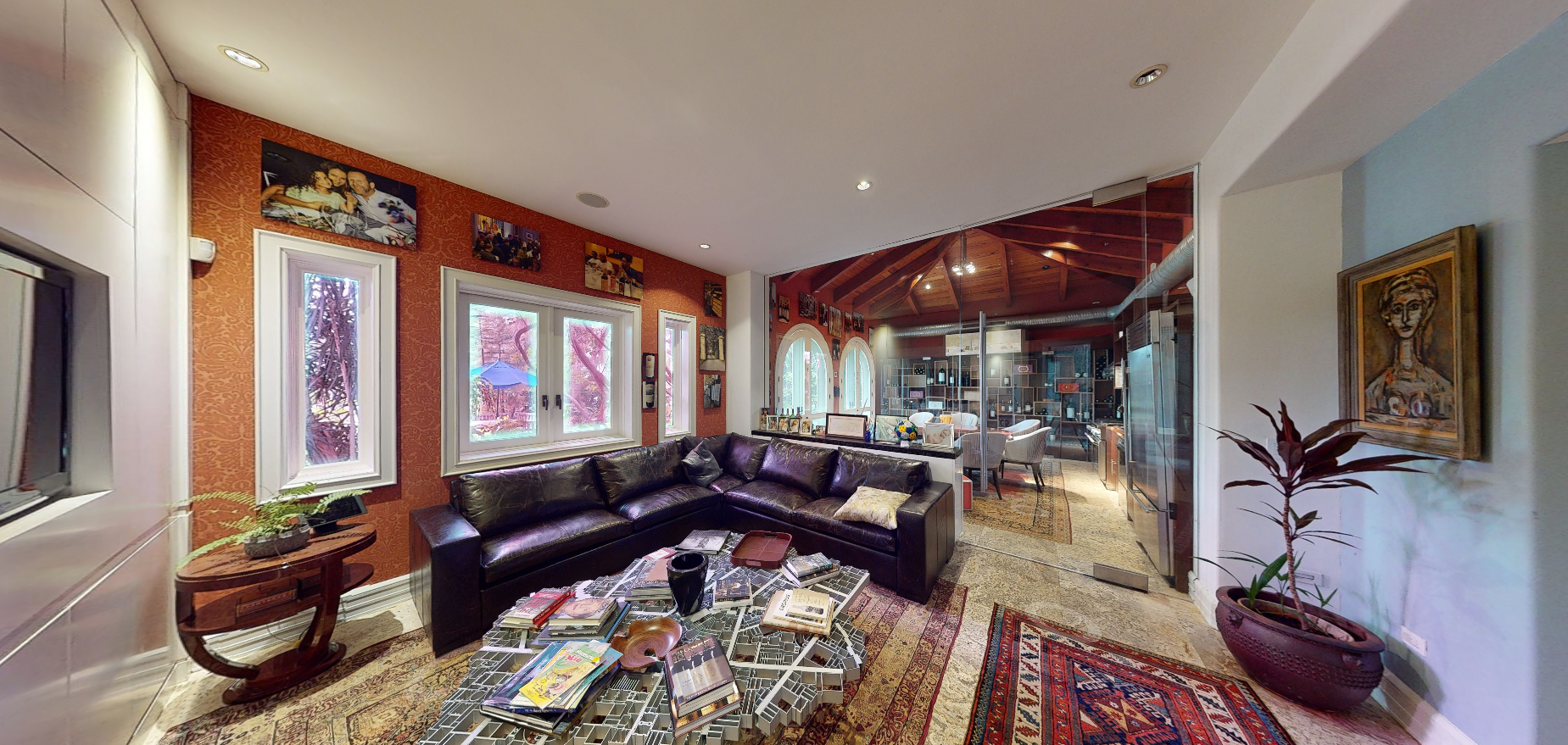 paint the walls in an off white color remove all the art and the furniture but the leather sofa also remove the rug and every other decor item like the coffee table do not modify the stone flooring