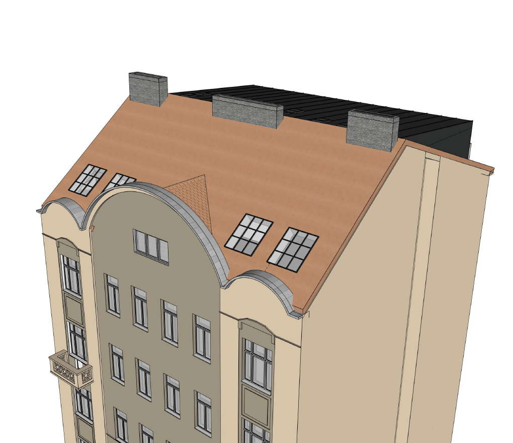 roof orange red brick color folded tile superstructure material black sheet metal reflections in the windows glass railing lots of greenery on the terrace