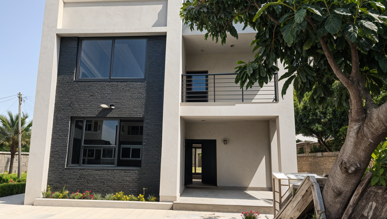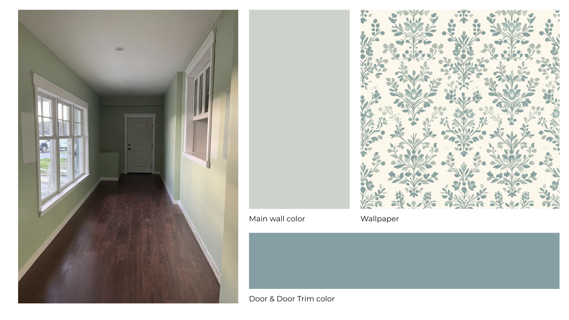 exterior shot use the mood board for colors and patterns only make changes to the back wall with the door the door to be painted the dark blue color door trim to be the dark blue color back wall is the wallpaper pattern