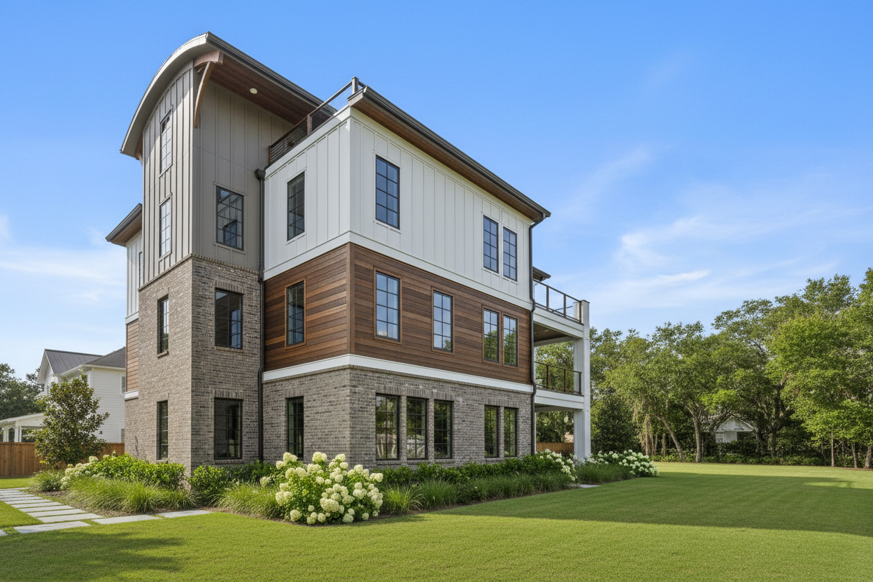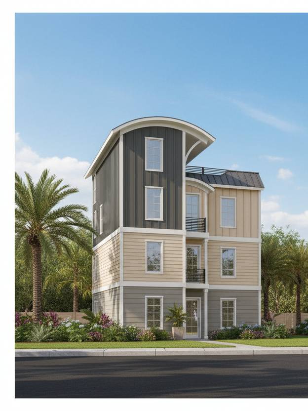 do a front elevation render using espresoo color on the left side and white everywhere else