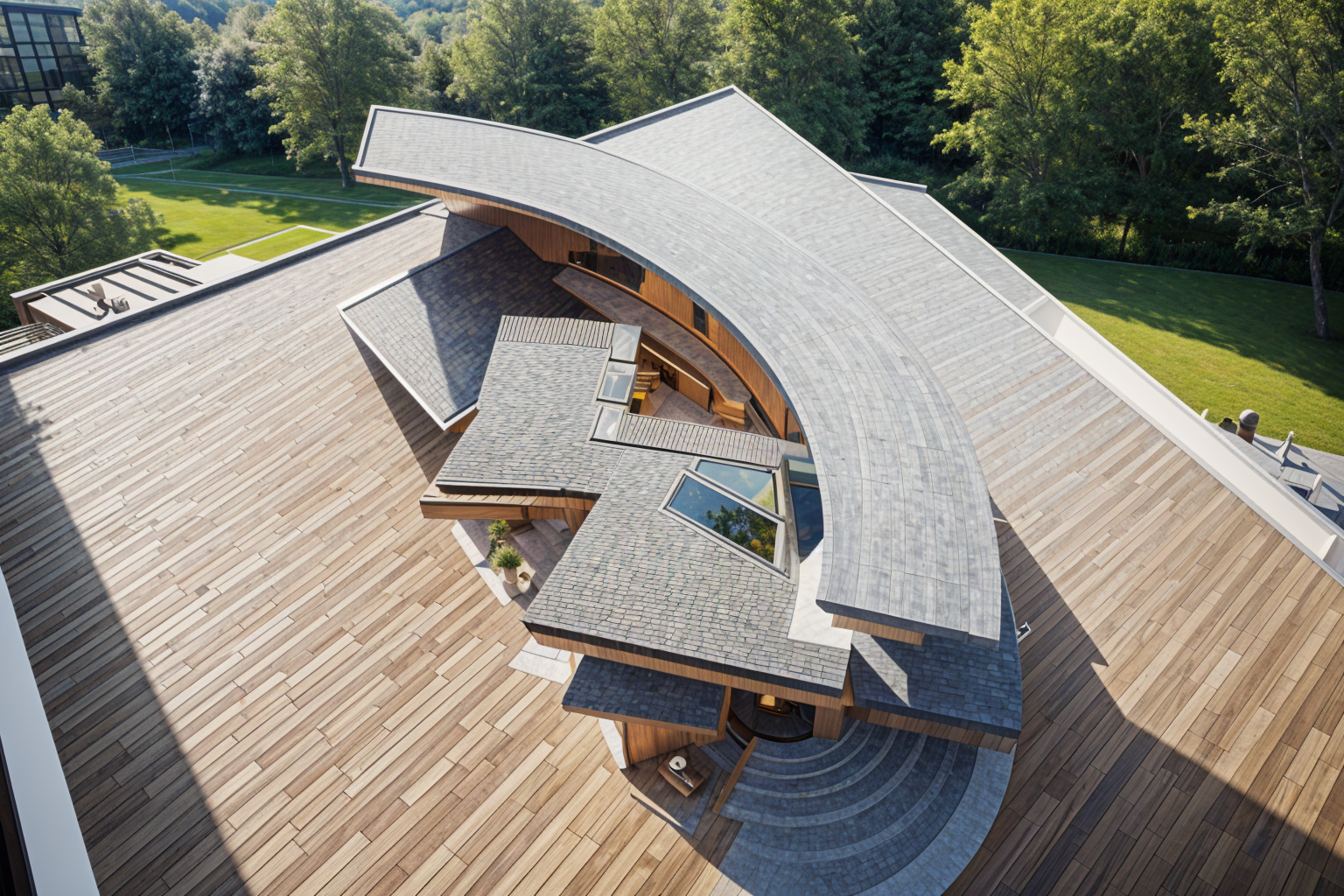 photo of a contemporary residential building showcasing minimalist architectural design featuring smooth beige stucco walls large windows with wooden slats and a sloped roof adorned with solar panels the urban setting includes neatly trimmed greenery and a pathway leading to the entrance morning sunlight casts gentle shadows on the facade highlighting textures and details captured from a low angle with a wide angle lens the perspective emphasizes the inviting entrance and surrounding garden creating a harmonious blend of nature and modern living