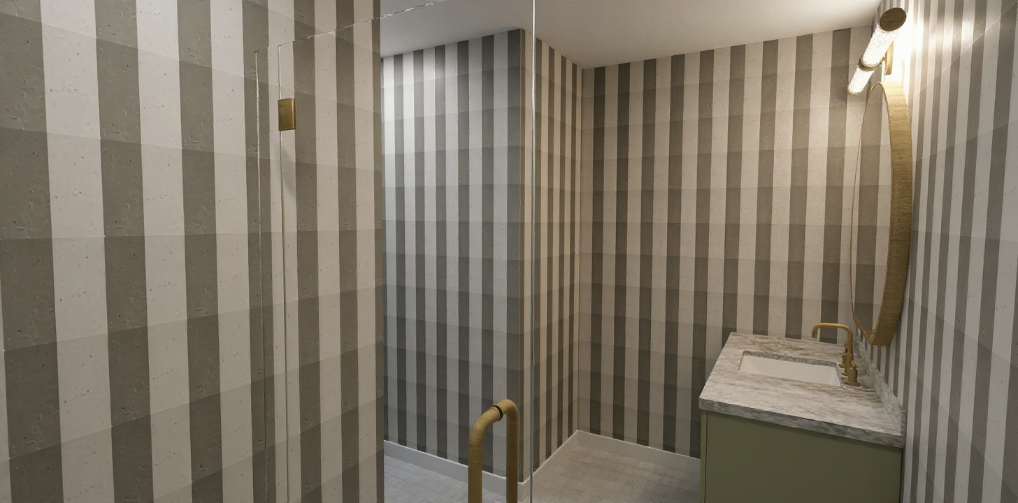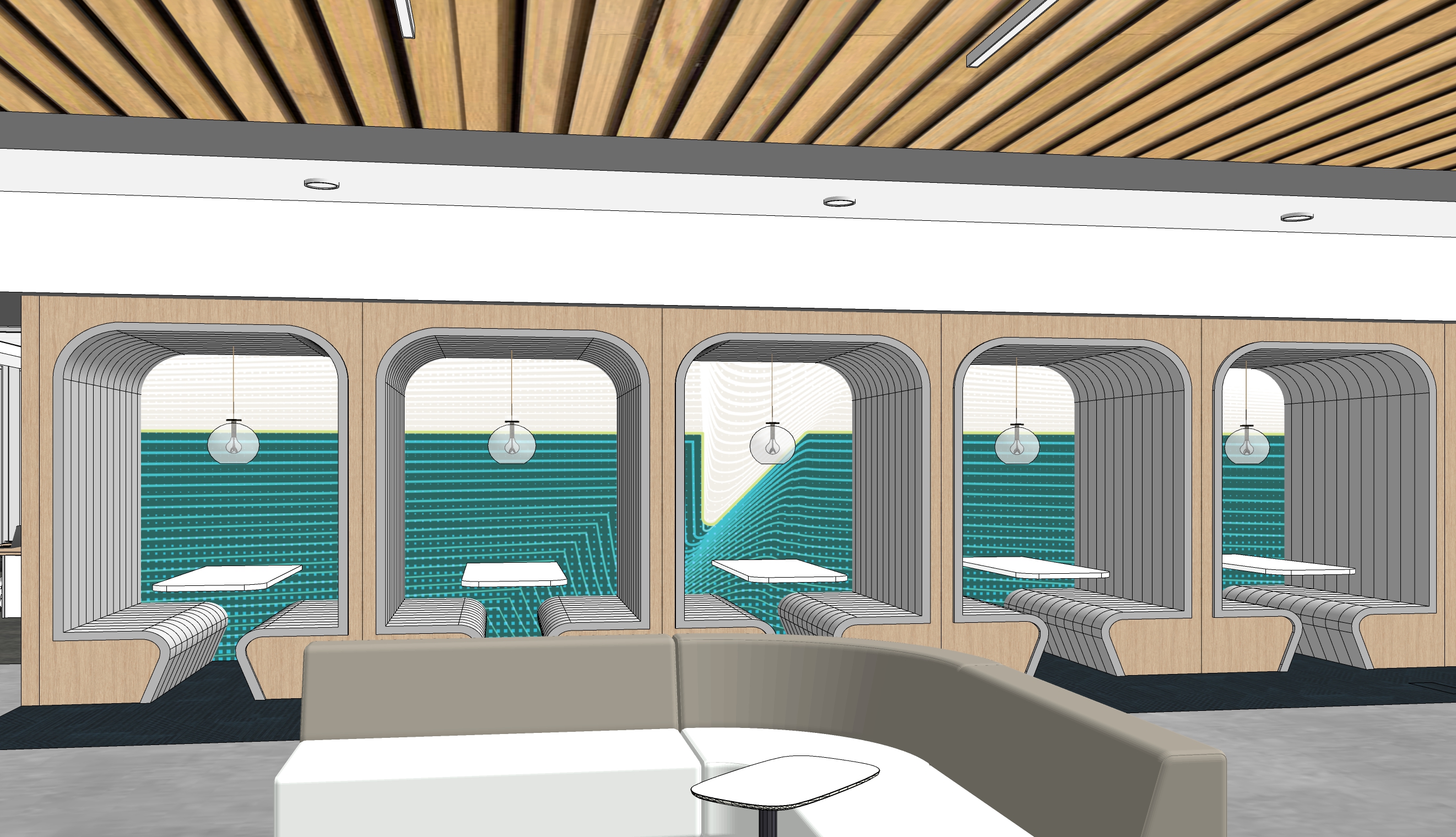 photorealistic interior white wall with a design featuring a combination of images and colors behind a oak wood seating furniture piece the wall is lit up with soft warm lighting and overall environment is soft bright lighting