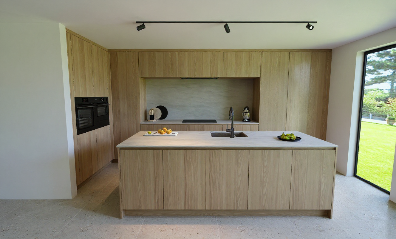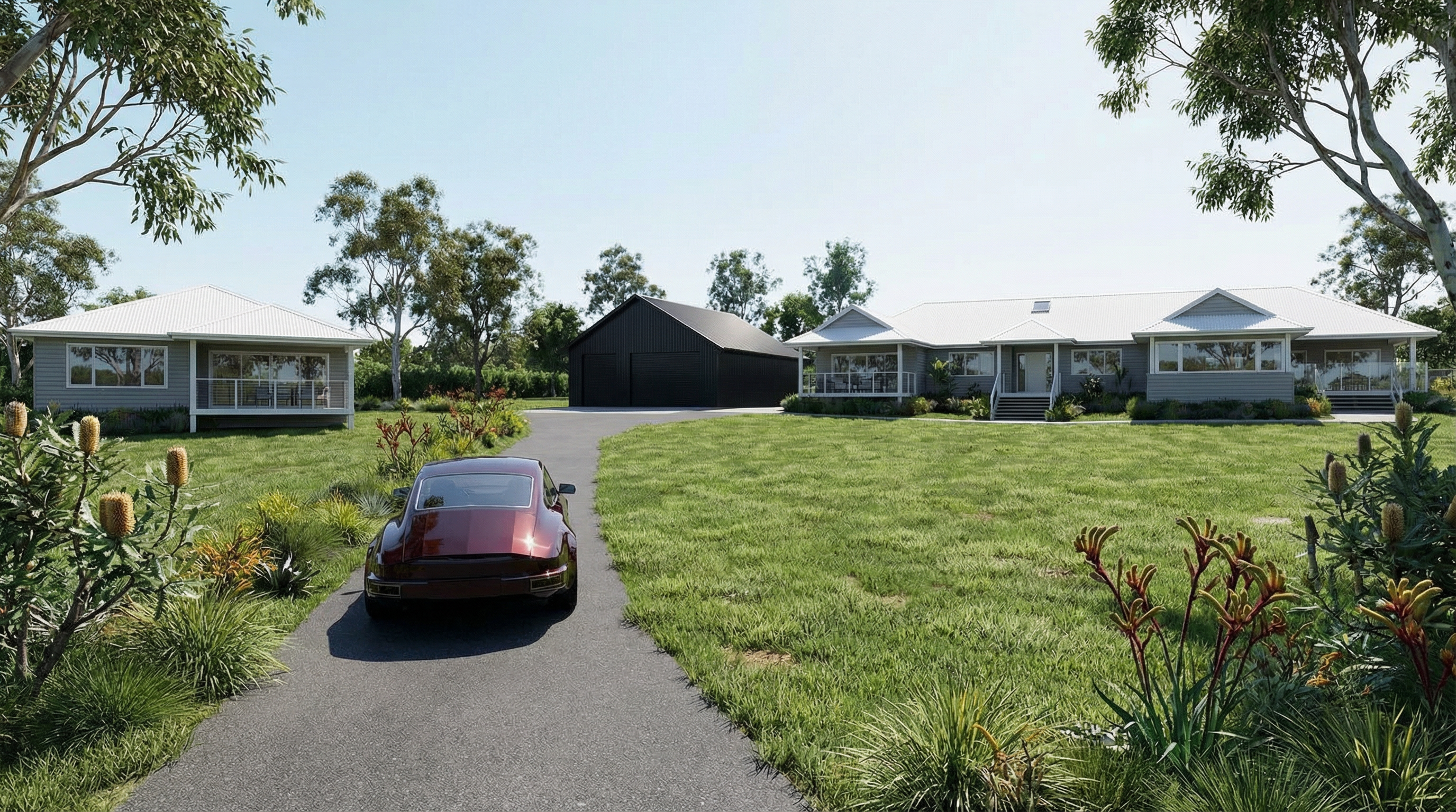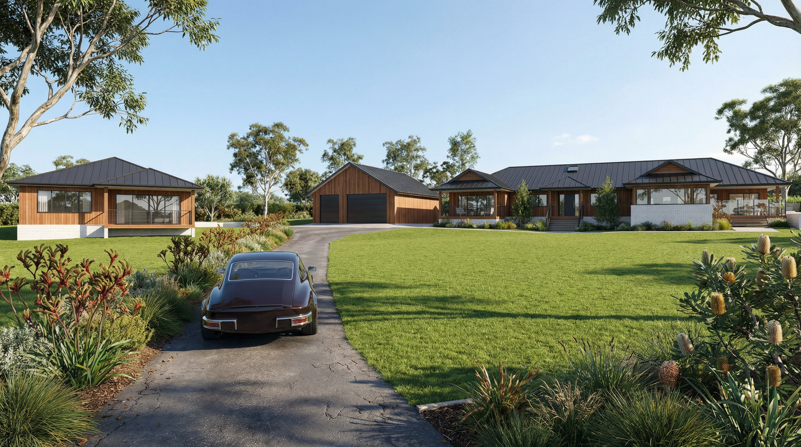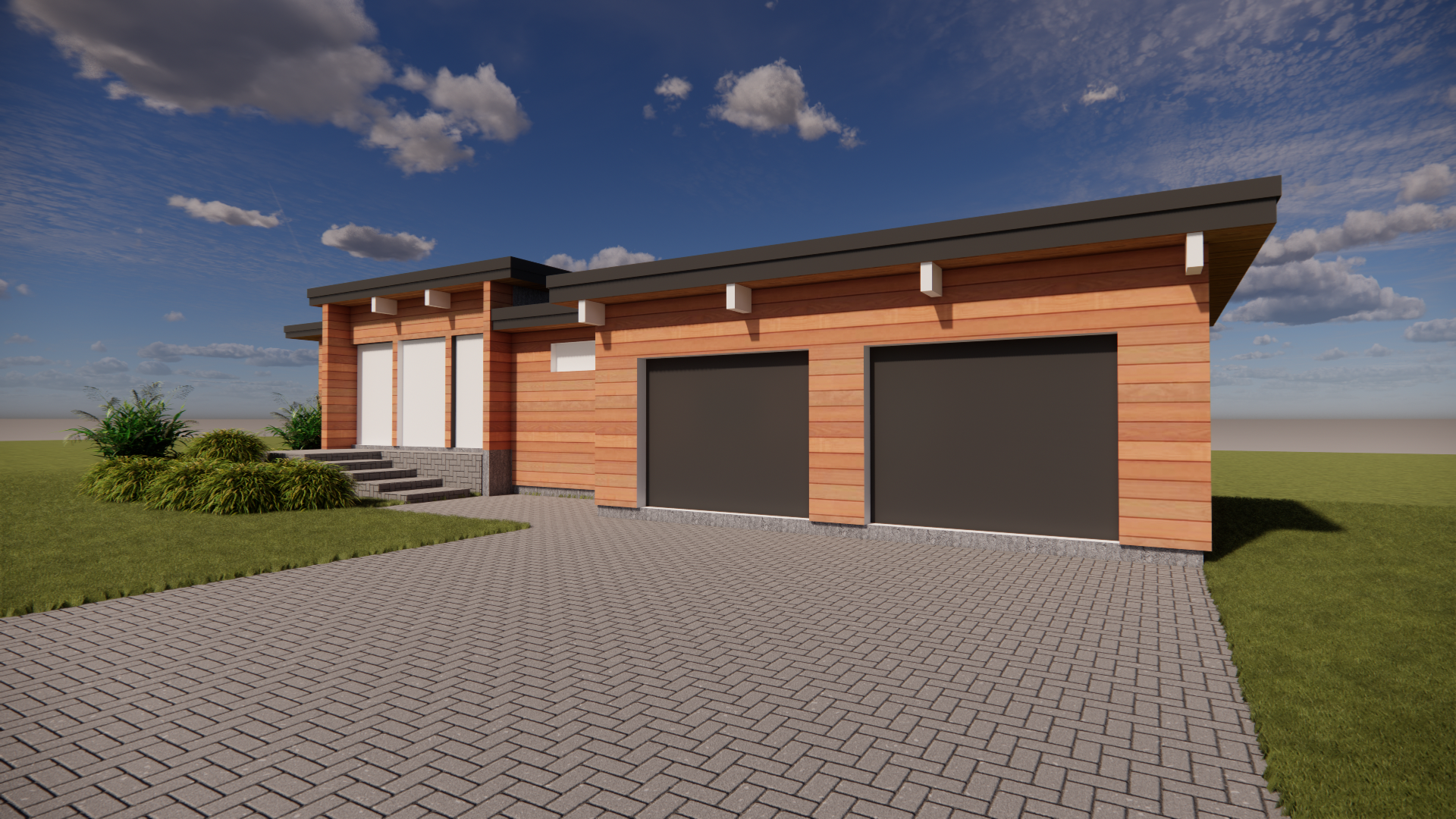 medium brown wood siding black trims black frames windows pine wood beams under the soffits a few trees around the house 2 persons one car in the driveway recessed light fixtures in the soffits