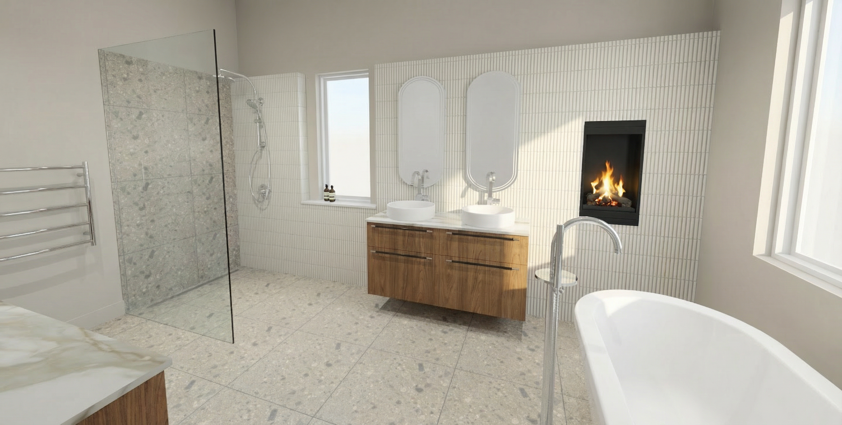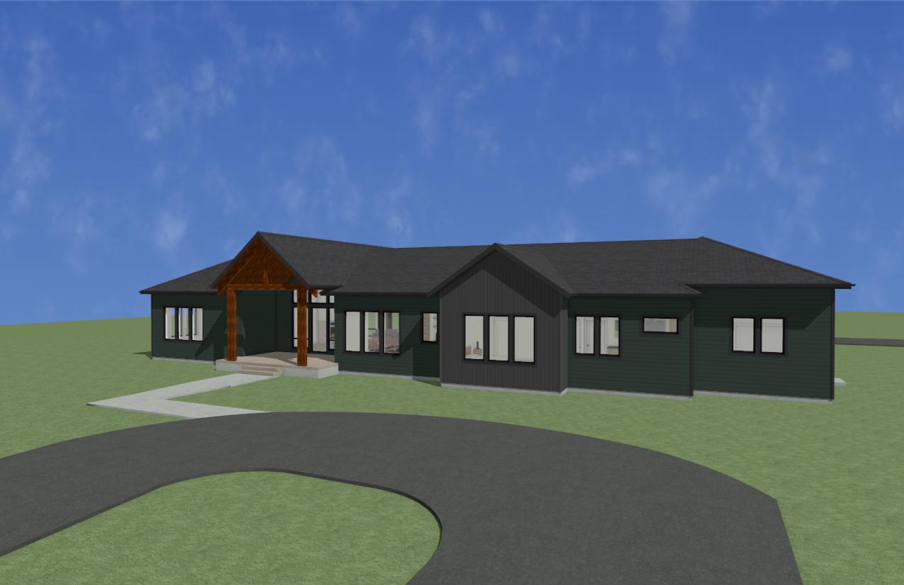 mountain modern single story house with a warm and inviting atmosphere featuring a roycroft bottle green and iron ore accent and black fox trim exterior black grey asphalt shingles and the beams should be woodscapes hawthorne sw3518 the house has a prominent wood framed gable entrance surround it with lush green grass and mix of landscape and hardscape and add a smooth asphalt driveway with concrete sidewalk leading to the entrance the sky is clear and bright blue with misty white clouds enhancing the tranquil and sunny setting set in a field in a valley