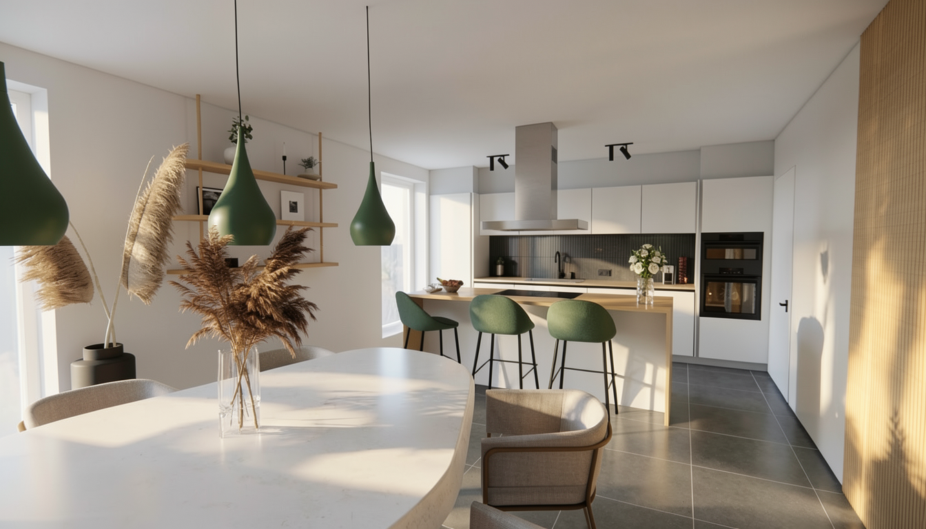 warm lightning hardwood flooring and white cabinets with black countertop and white bricks backsplash