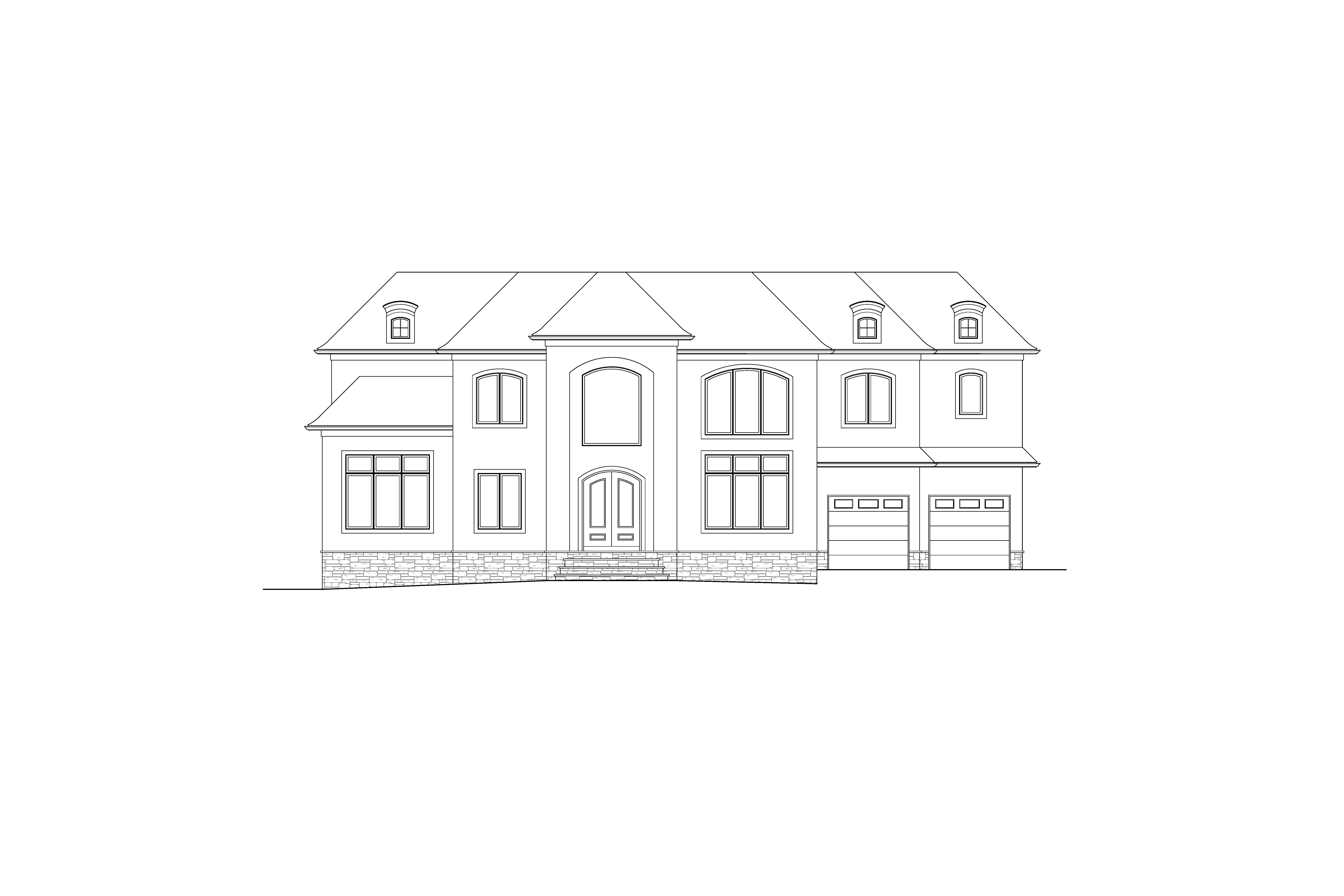 render realistic in a residential neighborhood with mature trees and lavish landscaping the stucco should be white with a black roof and black windows show a sidewalk and driveway leading up to the garage doors