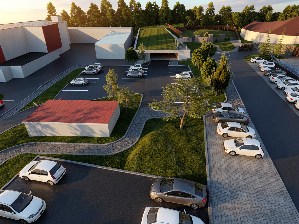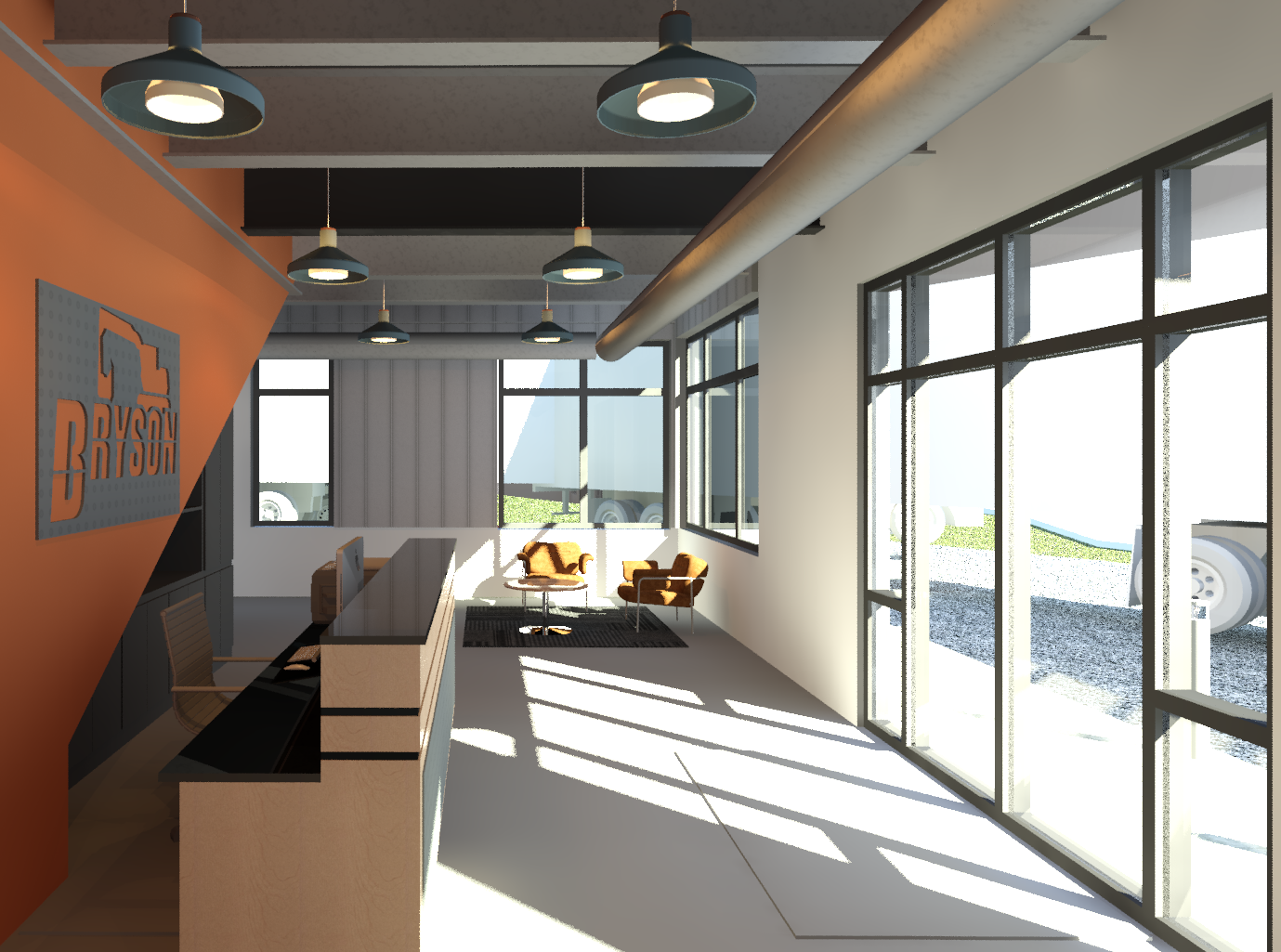 inside reception of modern office space industrial look with exposed steel structure concrete floors black windows and doors red painted wall to left of reception desk with a shiny metal logo sign sleek wood reception desk with black casework behind white rolling office chair tan and black waiting chairs with wood coffee table and black rug white walls
