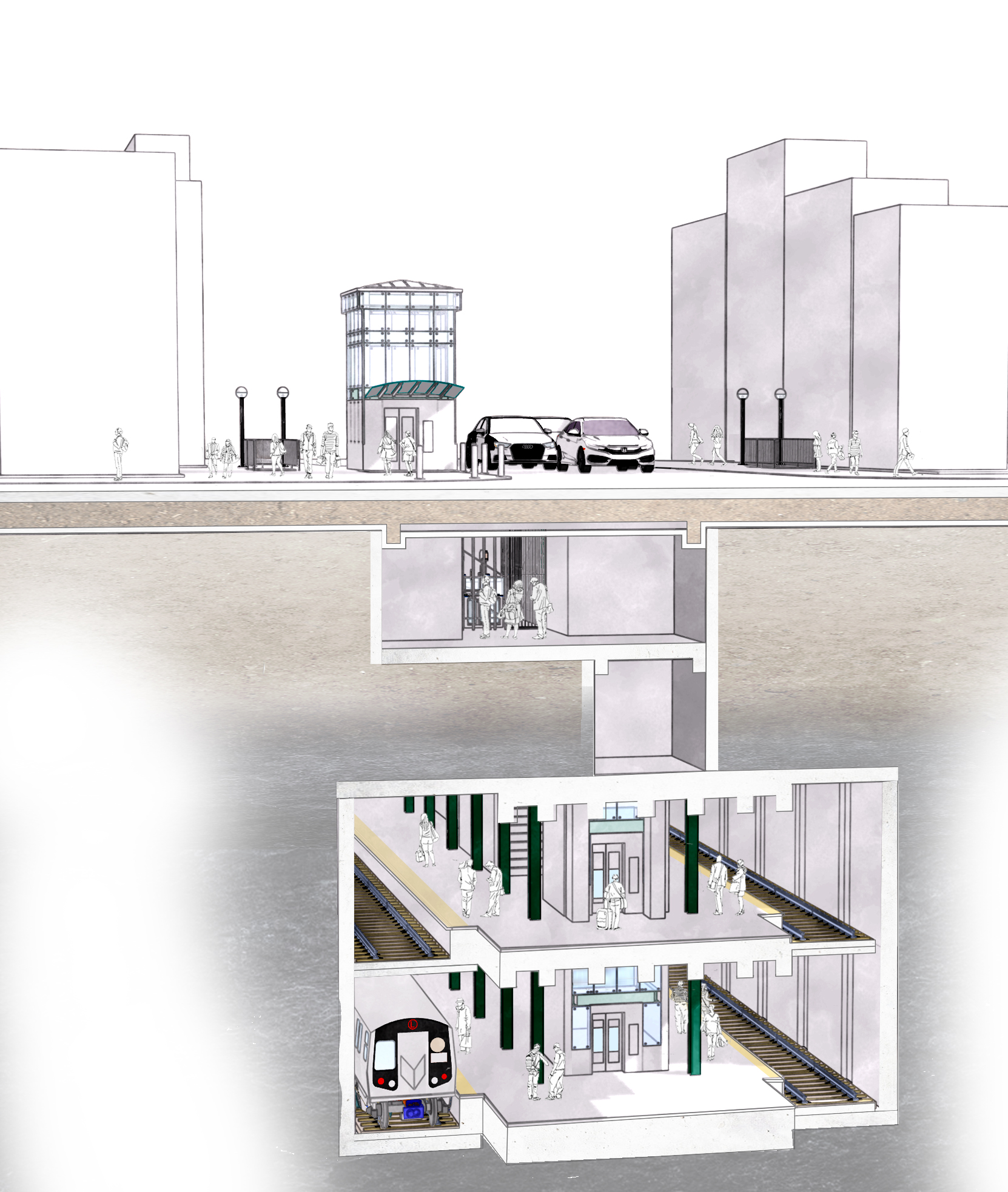 enhance this architectural sectional rendering of a new york mta subway station preserve the exact geometry proportions composition and all existing material textures maintain a realistic but clean architectural visualization style not sketchy not painterly keep concrete textures platform surfaces tracks and structural elements clearly visible and refined lighting introduce natural daylight from street level and allow soft daylight to penetrate into the underground platform through vertical openings stairs and elevator shafts ensure the platform is visibly lit with diffused daylight not dark or artificial keep street level bright with soft daylight and subtle shadows maintain a smooth light gradient transitioning from street to underground enhance material clarity concrete steel glass and tiles should appear clean and slightly refined but not overly realistic keep human figures minimal and subtle maintain original colors including green columns and yellow platform edges background buildings and trees should remain soft and secondary output style clean architectural section render realistic daylight high clarity minimal stylization professional presentation quality