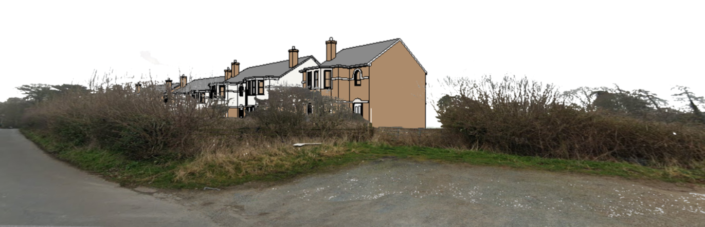 create a realistic render showing red brick georgian style houses nestled behind a hedgerow